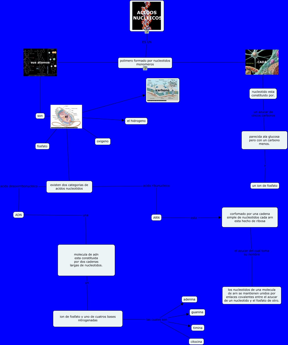 Este Cmap, tiene información relacionada con: ACIDOS NUCLEOTIDOS, corfomado por una cadena simple de nucleotidos cada arn esta hecho de ribosa el azucar del cual toma su nombre los nucleotidos de una molecula de arn se mantienen unidos por enlaces covalentes entre el azucar de un nucleotido y el fosfato de otro., polimero formado por nucleotidos monomeros sus atomos son, existen dos categorias de acidos nucleotidos acido ribunucleico ARN, son el el hidrogeno, ion de fosfato y uno de cuatros bases nitrogenadas las cuales son guanina, son el fosfato, nucleotido esta constituido por. un azucar de cincos carbonos parecida ala glucosa pero con un carbono menos., ACIDOS NUCLEICOS ES UN polimero formado por nucleotidos monomeros, son el carbono, molecula de adn esta constituida por dos cadenas largas de nucleotidos. un ion de fosfato y uno de cuatros bases nitrogenadas, son el oxigeno, son el existen dos categorias de acidos nucleotidos, polimero formado por nucleotidos monomeros CADA nucleotido esta constituido por., existen dos categorias de acidos nucleotidos acido desoxirribonucleico ADN, ADN una molecula de adn esta constituida por dos cadenas largas de nucleotidos., ion de fosfato y uno de cuatros bases nitrogenadas las cuales son timina, ion de fosfato y uno de cuatros bases nitrogenadas las cuales son adenina, ARN esta corfomado por una cadena simple de nucleotidos cada arn esta hecho de ribosa, ion de fosfato y uno de cuatros bases nitrogenadas las cuales son citocina, parecida ala glucosa pero con un carbono menos. y un ion de fosfato
