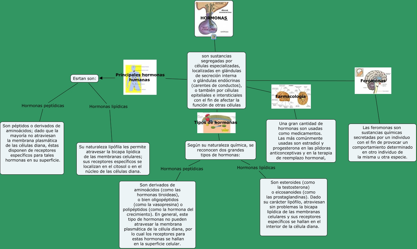 Este Cmap, tiene información relacionada con: hormonas andrea blanco, HORMONAS son son sustancias segregadas por células especializadas, localizadas en glándulas de secreción interna o glándulas endócrinas (carentes de conductos), o también por células epiteliales e intersticiales con el fin de afectar la función de otras células, Según su naturaleza química, se reconocen dos grandes tipos de hormonas: Hormonas lipídicas Son esteroides (como la testosterona) o eicosanoides (como las prostaglandinas). Dado su carácter lipófilo, atraviesan sin problemas la bicapa lipídica de las membranas celulares y sus receptores específicos se hallan en el interior de la célula diana., Según su naturaleza química, se reconocen dos grandes tipos de hormonas: Hormonas peptídicas Son derivados de aminoácidos (como las hormonas tiroideas), o bien oligopéptidos (como la vasopresina) o polipéptidos (como la hormona del crecimiento). En general, este tipo de hormonas no pueden atravesar la membrana plasmática de la célula diana, por lo cual los receptores para estas hormonas se hallan en la superficie celular., son sustancias segregadas por células especializadas, localizadas en glándulas de secreción interna o glándulas endócrinas (carentes de conductos), o también por células epiteliales e intersticiales con el fin de afectar la función de otras células Farmacología Una gran cantidad de hormonas son usadas como medicamentos. Las más comúnmente usadas son estradiol y progesterona en las píldoras anticonceptivas y en la terapia de reemplazo hormonal,, son sustancias segregadas por células especializadas, localizadas en glándulas de secreción interna o glándulas endócrinas (carentes de conductos), o también por células epiteliales e intersticiales con el fin de afectar la función de otras células Tipos de hormonas Según su naturaleza química, se reconocen dos grandes tipos de hormonas:, son sustancias segregadas por células especializadas, localizadas en glándulas de secreción interna o glándulas endócrinas (carentes de conductos), o también por células epiteliales e intersticiales con el fin de afectar la función de otras células Principales hormonas humanas Esrtan son:, Esrtan son: Hormonas peptídicas Son péptidos o derivados de aminoácidos; dado que la mayoría no atraviesan la membrana plasmática de las células diana, éstas disponen de receptores específicos para tales hormonas en su superficie., son sustancias segregadas por células especializadas, localizadas en glándulas de secreción interna o glándulas endócrinas (carentes de conductos), o también por células epiteliales e intersticiales con el fin de afectar la función de otras células Feromonas Las feromonas son sustancias químicas secretadas por un individuo con el fin de provocar un comportamiento determinado en otro individuo de la misma u otra especie., Esrtan son: Hormonas lipídicas Su naturaleza lipófila les permite atravesar la bicapa lipídica de las membranas celulares; sus receptores específicos se localizan en el citosol o en el núcleo de las células diana.