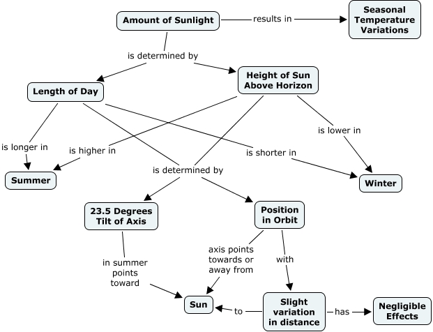 This Concept Map, created with IHMC CmapTools, has information related to: Marius' Seasons, Position in Orbit with Slight variation in distance, Height of Sun Above Horizon is determined by 23.5 Degrees Tilt of Axis, Position in Orbit axis points towards or away from Sun, 23.5 Degrees Tilt of Axis in summer points toward Sun, Height of Sun Above Horizon is higher in Summer, Amount of Sunlight results in Seasonal Temperature Variations, Length of Day is longer in Summer, Length of Day is shorter in Winter, Length of Day is determined by 23.5 Degrees Tilt of Axis, Length of Day is determined by Position in Orbit, Amount of Sunlight is determined by Height of Sun Above Horizon, Height of Sun Above Horizon is determined by Position in Orbit, Slight variation in distance has Negligible Effects, Height of Sun Above Horizon is lower in Winter, Amount of Sunlight is determined by Length of Day, Slight variation in distance to Sun
