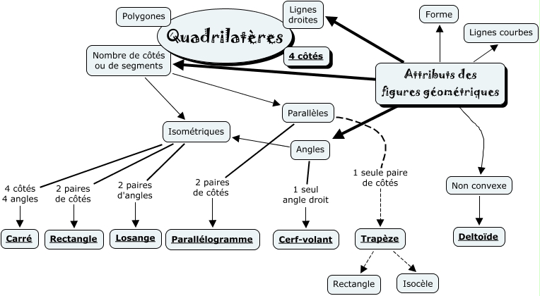 Cette carte conceptuelle, cree avec IHMC CmapTools, contient des informations liees a : Angles et firgures géométriques, Attributs des figures géométriques Nombre de côtés ou de segments, Attributs des figures géométriques Lignes droites, Trapèze Isocèle, Isométriques 4 côtés 4 angles Carré, Attributs des figures géométriques Lignes courbes, Attributs des figures géométriques Forme, Parallèles 1 seule paire de côtés Trapèze, Parallèles 2 paires de côtés Parallélogramme, Nombre de côtés ou de segments Isométriques, Isométriques 2 paires de côtés Rectangle, Angles 1 seul angle droit Cerf-volant, Attributs des figures géométriques Angles, Attributs des figures géométriques Non convexe, Isométriques 2 paires d'angles Losange, Angles Isométriques, Non convexe Deltoïde, Nombre de côtés ou de segments Parallèles, Trapèze Rectangle