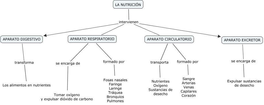 Este mapa conceptual tiene información relacionada a: LA NUTRICIÓN. Adriana y Alfonso, LA NUTRICIÓN intervienen APARATO EXCRETOR, APARATO CIRCULATORIO formado por Sangre Arterias Venas Capilares Corazón, LA NUTRICIÓN intervienen APARATO RESPIRATORIO, LA NUTRICIÓN intervienen APARATO CIRCULATORIO, APARATO RESPIRATORIO se encarga de Tomar oxígeno y expulsar dióxido de carbono, APARATO DIGESTIVO transforma Los alimentos en nutrientes, APARATO CIRCULATORIO transporta Nutrientes Oxígeno Sustancias de desecho, APARATO EXCRETOR se encarga de Expulsar sustancias de desecho, LA NUTRICIÓN intervienen APARATO DIGESTIVO, APARATO RESPIRATORIO formado por Fosas nasales Faringe Laringe Tráquea Bronquios Pulmones