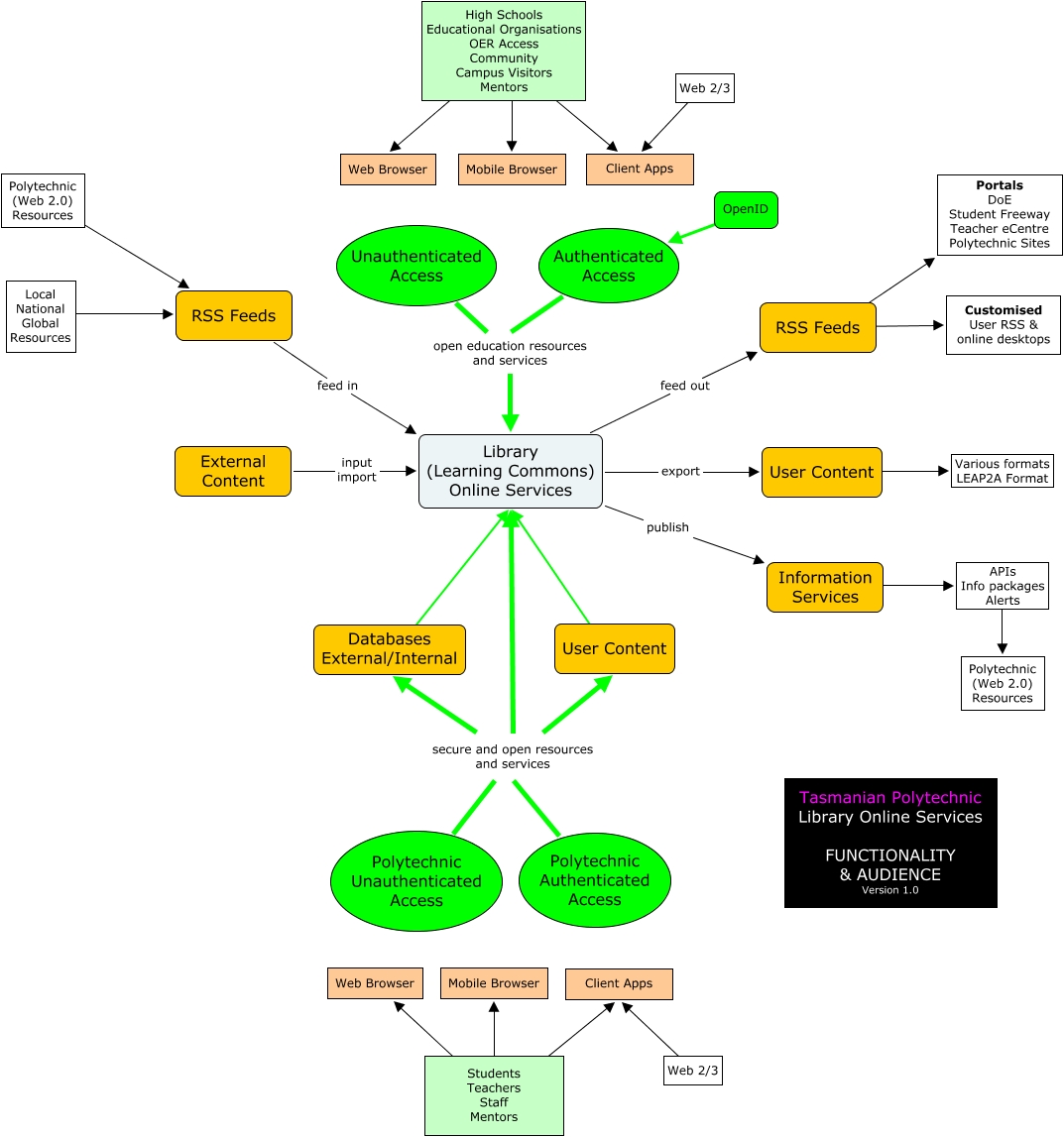 This Concept Map, created with IHMC CmapTools, has information related to: Learning Commons Functionality, Polytechnic Unauthenticated Access secure and open resources and services Library (Learning Commons) Online Services, RSS Feeds ???? Customised User RSS & online desktops, Polytechnic Authenticated Access secure and open resources and services User Content, High Schools Educational Organisations OER Access Community Campus Visitors Mentors ???? Web Browser, Polytechnic Unauthenticated Access secure and open resources and services Databases External/Internal, User Content ???? Various formats LEAP2A Format, Polytechnic Unauthenticated Access secure and open resources and services User Content, Polytechnic Authenticated Access secure and open resources and services Library (Learning Commons) Online Services, External Content input import Library (Learning Commons) Online Services, Information Services ???? APIs Info packages Alerts, Unauthenticated Access open education resources and services Library (Learning Commons) Online Services, User Content ???? Library (Learning Commons) Online Services, High Schools Educational Organisations OER Access Community Campus Visitors Mentors ???? Client Apps, RSS Feeds feed in Library (Learning Commons) Online Services, Library (Learning Commons) Online Services export User Content, RSS Feeds ???? Portals DoE Student Freeway Teacher eCentre Polytechnic Sites, Web 2/3 ???? Client Apps, Students Teachers Staff Mentors ???? Mobile Browser, APIs Info packages Alerts ???? Polytechnic (Web 2.0) Resources, Authenticated Access open education resources and services Library (Learning Commons) Online Services