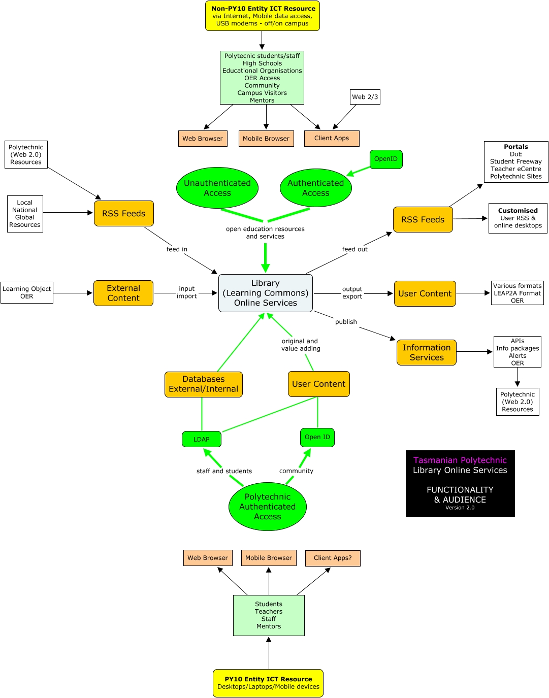 This Concept Map, created with IHMC CmapTools, has information related to: Learning Commons Functionality v2, RSS Feeds ???? Customised User RSS & online desktops, Polytechnic Authenticated Access staff and students LDAP, RSS Feeds feed in Library (Learning Commons) Online Services, Polytechnic Authenticated Access community Open ID, PY10 Entity ICT Resource Desktops/Laptops/Mobile devices ???? Students Teachers Staff Mentors, External Content input import Library (Learning Commons) Online Services, OpenID ???? Authenticated Access, Students Teachers Staff Mentors ???? Client Apps?, Students Teachers Staff Mentors ???? Web Browser, Information Services ???? APIs Info packages Alerts OER, Polytecnic students/staff High Schools Educational Organisations OER Access Community Campus Visitors Mentors ???? Mobile Browser, LDAP ???? Databases External/Internal, APIs Info packages Alerts OER ???? Polytechnic (Web 2.0) Resources, Authenticated Access open education resources and services Library (Learning Commons) Online Services, Non-PY10 Entity ICT Resource via Internet, Mobile data access, USB modems - off/on campus ???? Polytecnic students/staff High Schools Educational Organisations OER Access Community Campus Visitors Mentors, Learning Object OER ???? External Content, Polytechnic (Web 2.0) Resources ???? RSS Feeds, Authenticated Access open education resources and services Unauthenticated Access, Web 2/3 ???? Client Apps, Databases External/Internal ???? Library (Learning Commons) Online Services