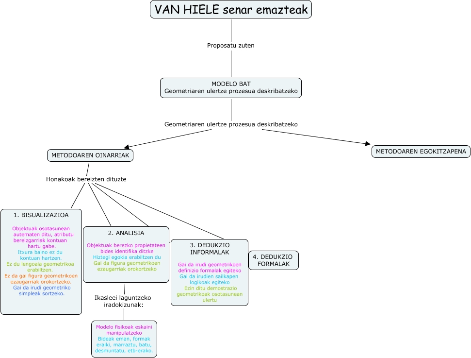 Este Cmap, tiene información relacionada con: mapa contzeptuala, MODELO BAT Geometriaren ulertze prozesua deskribatzeko Geometriaren ulertze prozesua deskribatzeko METODOAREN OINARRIAK, MODELO BAT Geometriaren ulertze prozesua deskribatzeko Geometriaren ulertze prozesua deskribatzeko METODOAREN EGOKITZAPENA, METODOAREN OINARRIAK Honakoak bereizten dituzte 2. ANALISIA Objektuak berezko propietateen bides identifika ditzke Hiztegi egokia erabiltzen du Gai da figura geometrikoen ezaugarriak orokortzeko, METODOAREN OINARRIAK Honakoak bereizten dituzte 1. BISUALIZAZIOA Objektuak osotasunean autematen ditu, atributu bereizgarriak kontuan hartu gabe. Itxura baino ez du kontuan hartzen. Ez du lengoaia geometrikoa erabiltzen. Ez da gai figura geometrikoen ezaugarriak orokortzeko. Gai da irudi geometriko simpleak sortzeko., VAN HIELE senar emazteak Proposatu zuten MODELO BAT Geometriaren ulertze prozesua deskribatzeko, METODOAREN OINARRIAK Honakoak bereizten dituzte 4. DEDUKZIO FORMALAK, 2. ANALISIA Objektuak berezko propietateen bides identifika ditzke Hiztegi egokia erabiltzen du Gai da figura geometrikoen ezaugarriak orokortzeko Ikasleei laguntzeko iradokizunak: Modelo fisikoak eskaini manipulatzeko Bideak eman, formak eraiki, marraztu, batu, desmuntatu, etb-erako., METODOAREN OINARRIAK Honakoak bereizten dituzte 3. DEDUKZIO INFORMALAK Gai da irudi geometrikoen definizio formalak egiteko Gai da irudien sailkapen logikoak egiteko Ezin ditu demostrazio geometrikoak osotasunean ulertu