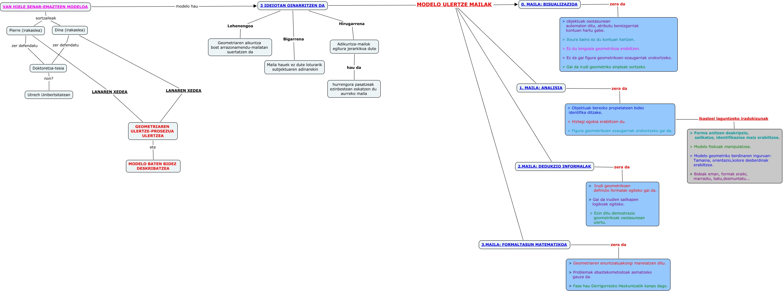 Este Cmap, tiene información relacionada con: van hiele, > Objektuak berezko propietateen bidez identifika ditzake. > Hiztegi egokia erabiltzen du. > Figura geometrikoen ezaugarriak orokortzeko gai da. ikasleei laguntzeko iradokizunak > Forma anitzen deskripzio, sailkatze, identifikazioa maiz erabiltzea. > Modelo fisikoak manipulatzea. > Modelo geometriko berdinaren inguruan: Tamaina, orientazio,kolore desberdinak erabiltzea. > Bideak eman, formak eraiki, marraztu, batu,desmuntatu..., 3.MAILA: FORMALTASUN MATEMATIKOA zera da > Geometriaren enuntziatuakongi maneiatzen ditu. > Problemak ebaztekometodoak asmatzeko gauza da. > Fase hau Derrigorrezko Hezkuntzatik kanpo dago., VAN HIELE SENAR-EMAZTEEN MODELOA sortzaileak Pierre (irakaslea), Doktoretza-tesia non? Utrech Unibertsitatean, Dina (irakaslea) zer defendatu Doktoretza-tesia, Adikuntza-mailok egitura jerarkikoa dute hau da hurrengora pasatzeak ezinbestean eskatzen du aurreko maila, 1. MAILA: ANALISIA zera da > Objektuak berezko propietateen bidez identifika ditzake. > Hiztegi egokia erabiltzen du. > Figura geometrikoen ezaugarriak orokortzeko gai da., 3 IDEIOTAN OINARRITZEN DA Hirugarrena Adikuntza-mailok egitura jerarkikoa dute, 3 IDEIOTAN OINARRITZEN DA Lehenengoa Geometriaren aikuntza bost arrazonamendu-mailatan suertatzen da, 3 IDEIOTAN OINARRITZEN DA MODELO ULERTZE MAILAK 3.MAILA: FORMALTASUN MATEMATIKOA, 3 IDEIOTAN OINARRITZEN DA MODELO ULERTZE MAILAK 2.MAILA: DEDUKZIO INFORMALAK, VAN HIELE SENAR-EMAZTEEN MODELOA sortzaileak Dina (irakaslea), Pierre (irakaslea) LANAREN XEDEA GEOMETRIAREN ULERTZE-PROSEZUA ULERTZEA, 3 IDEIOTAN OINARRITZEN DA MODELO ULERTZE MAILAK 0. MAILA: BISUALIZAZIOA, Dina (irakaslea) LANAREN XEDEA GEOMETRIAREN ULERTZE-PROSEZUA ULERTZEA, 3 IDEIOTAN OINARRITZEN DA MODELO ULERTZE MAILAK 1. MAILA: ANALISIA, VAN HIELE SENAR-EMAZTEEN MODELOA modelo hau 3 IDEIOTAN OINARRITZEN DA, 2.MAILA: DEDUKZIO INFORMALAK zera da > Irudi geometrikoen definizio formalak egiteko gai da. > Gai da irudien sailkapen logikoak egiteko. > Ezin ditu demostrazio geometrikoak osotasunean ulertu., 3 IDEIOTAN OINARRITZEN DA Bigarrena Maila hauek ez dute loturarik subjektuaren adinarekin, Pierre (irakaslea) zer defendatu Doktoretza-tesia