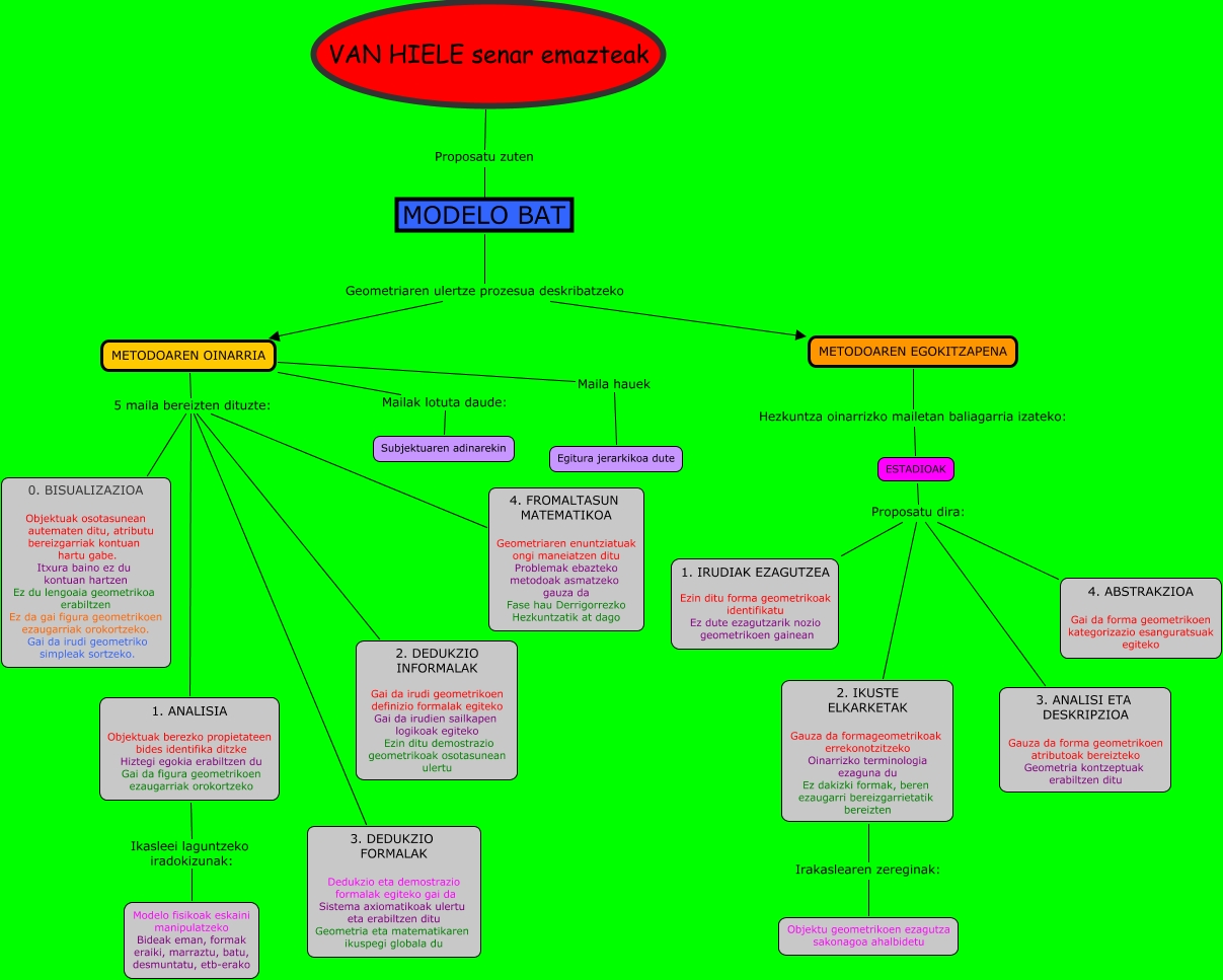 Este Cmap, tiene información relacionada con: Martinez Lazkano Ioritz, METODOAREN OINARRIA 5 maila bereizten dituzte: 0. BISUALIZAZIOA Objektuak osotasunean autematen ditu, atributu bereizgarriak kontuan hartu gabe. Itxura baino ez du kontuan hartzen Ez du lengoaia geometrikoa erabiltzen Ez da gai figura geometrikoen ezaugarriak orokortzeko. Gai da irudi geometriko simpleak sortzeko., METODOAREN OINARRIA Maila hauek Egitura jerarkikoa dute, METODOAREN EGOKITZAPENA Hezkuntza oinarrizko mailetan baliagarria izateko: ESTADIOAK, METODOAREN OINARRIA 5 maila bereizten dituzte: 1. ANALISIA Objektuak berezko propietateen bides identifika ditzke Hiztegi egokia erabiltzen du Gai da figura geometrikoen ezaugarriak orokortzeko, ESTADIOAK Proposatu dira: 3. ANALISI ETA DESKRIPZIOA Gauza da forma geometrikoen atributoak bereizteko Geometria kontzeptuak erabiltzen ditu, ESTADIOAK Proposatu dira: 2. IKUSTE ELKARKETAK Gauza da formageometrikoak errekonotzitzeko Oinarrizko terminologia ezaguna du Ez dakizki formak, beren ezaugarri bereizgarrietatik bereizten, METODOAREN OINARRIA 5 maila bereizten dituzte: 4. FROMALTASUN MATEMATIKOA Geometriaren enuntziatuak ongi maneiatzen ditu Problemak ebazteko metodoak asmatzeko gauza da Fase hau Derrigorrezko Hezkuntzatik at dago, 2. IKUSTE ELKARKETAK Gauza da formageometrikoak errekonotzitzeko Oinarrizko terminologia ezaguna du Ez dakizki formak, beren ezaugarri bereizgarrietatik bereizten Irakaslearen zereginak: Objektu geometrikoen ezagutza sakonagoa ahalbidetu, METODOAREN OINARRIA Mailak lotuta daude: Subjektuaren adinarekin, METODOAREN OINARRIA 5 maila bereizten dituzte: 3. DEDUKZIO FORMALAK Dedukzio eta demostrazio formalak egiteko gai da Sistema axiomatikoak ulertu eta erabiltzen ditu Geometria eta matematikaren ikuspegi globala du, ESTADIOAK Proposatu dira: 1. IRUDIAK EZAGUTZEA Ezin ditu forma geometrikoak identifikatu Ez dute ezagutzarik nozio geometrikoen gainean, MODELO BAT Geometriaren ulertze prozesua deskribatzeko METODOAREN OINARRIA, 1. ANALISIA Objektuak berezko propietateen bides identifika ditzke Hiztegi egokia erabiltzen du Gai da figura geometrikoen ezaugarriak orokortzeko Ikasleei laguntzeko iradokizunak: Modelo fisikoak eskaini manipulatzeko Bideak eman, formak eraiki, marraztu, batu, desmuntatu, etb-erako, METODOAREN OINARRIA 5 maila bereizten dituzte: 2. DEDUKZIO INFORMALAK Gai da irudi geometrikoen definizio formalak egiteko Gai da irudien sailkapen logikoak egiteko Ezin ditu demostrazio geometrikoak osotasunean ulertu, VAN HIELE senar emazteak Proposatu zuten MODELO BAT, ESTADIOAK Proposatu dira: 4. ABSTRAKZIOA Gai da forma geometrikoen kategorizazio esanguratsuak egiteko, MODELO BAT Geometriaren ulertze prozesua deskribatzeko METODOAREN EGOKITZAPENA