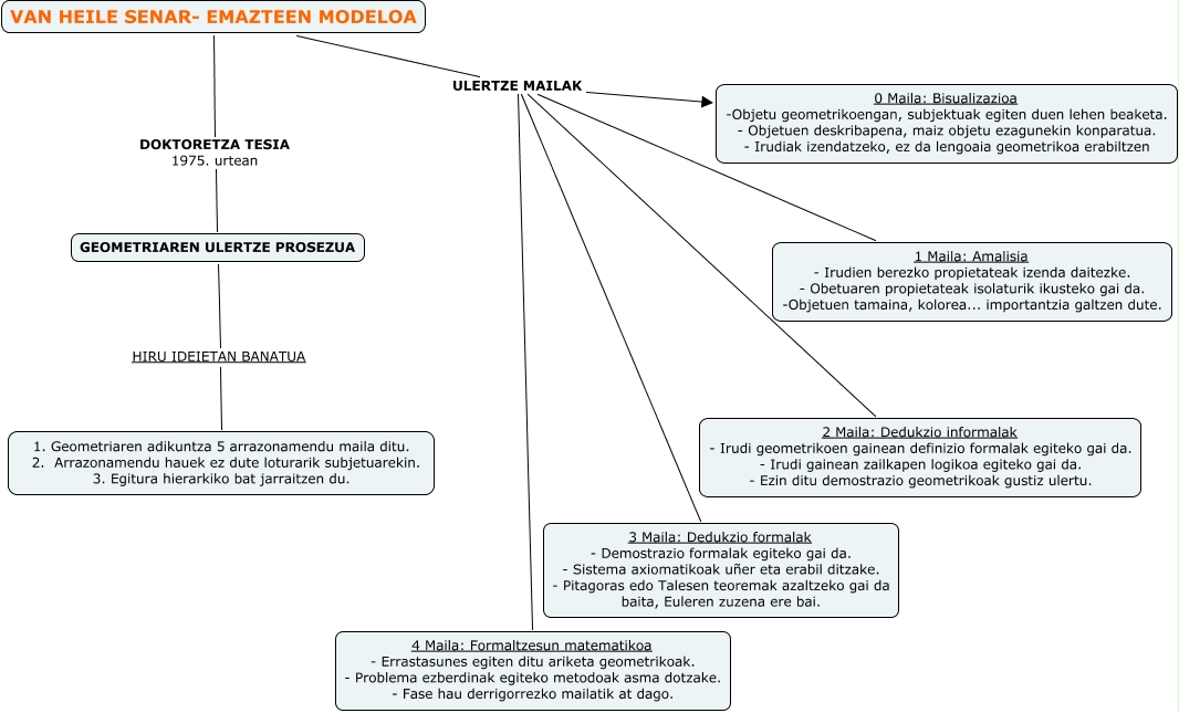 Este Cmap, tiene información relacionada con: Sin Título 1, VAN HEILE SENAR- EMAZTEEN MODELOA ULERTZE MAILAK 0 Maila: Bisualizazioa -Objetu geometrikoengan, subjektuak egiten duen lehen beaketa. - Objetuen deskribapena, maiz objetu ezagunekin konparatua. - Irudiak izendatzeko, ez da lengoaia geometrikoa erabiltzen, VAN HEILE SENAR- EMAZTEEN MODELOA ULERTZE MAILAK 3 Maila: Dedukzio formalak - Demostrazio formalak egiteko gai da. - Sistema axiomatikoak uñer eta erabil ditzake. - Pitagoras edo Talesen teoremak azaltzeko gai da baita, Euleren zuzena ere bai., GEOMETRIAREN ULERTZE PROSEZUA HIRU IDEIETAN BANATUA 1. Geometriaren adikuntza 5 arrazonamendu maila ditu. 2. Arrazonamendu hauek ez dute loturarik subjetuarekin. 3. Egitura hierarkiko bat jarraitzen du., VAN HEILE SENAR- EMAZTEEN MODELOA ULERTZE MAILAK 2 Maila: Dedukzio informalak - Irudi geometrikoen gainean definizio formalak egiteko gai da. - Irudi gainean zailkapen logikoa egiteko gai da. - Ezin ditu demostrazio geometrikoak gustiz ulertu., VAN HEILE SENAR- EMAZTEEN MODELOA ULERTZE MAILAK 4 Maila: Formaltzesun matematikoa - Errastasunes egiten ditu ariketa geometrikoak. - Problema ezberdinak egiteko metodoak asma dotzake. - Fase hau derrigorrezko mailatik at dago., VAN HEILE SENAR- EMAZTEEN MODELOA DOKTORETZA TESIA 1975. urtean GEOMETRIAREN ULERTZE PROSEZUA, VAN HEILE SENAR- EMAZTEEN MODELOA ULERTZE MAILAK 1 Maila: Amalisia - Irudien berezko propietateak izenda daitezke. - Obetuaren propietateak isolaturik ikusteko gai da. -Objetuen tamaina, kolorea... importantzia galtzen dute.
