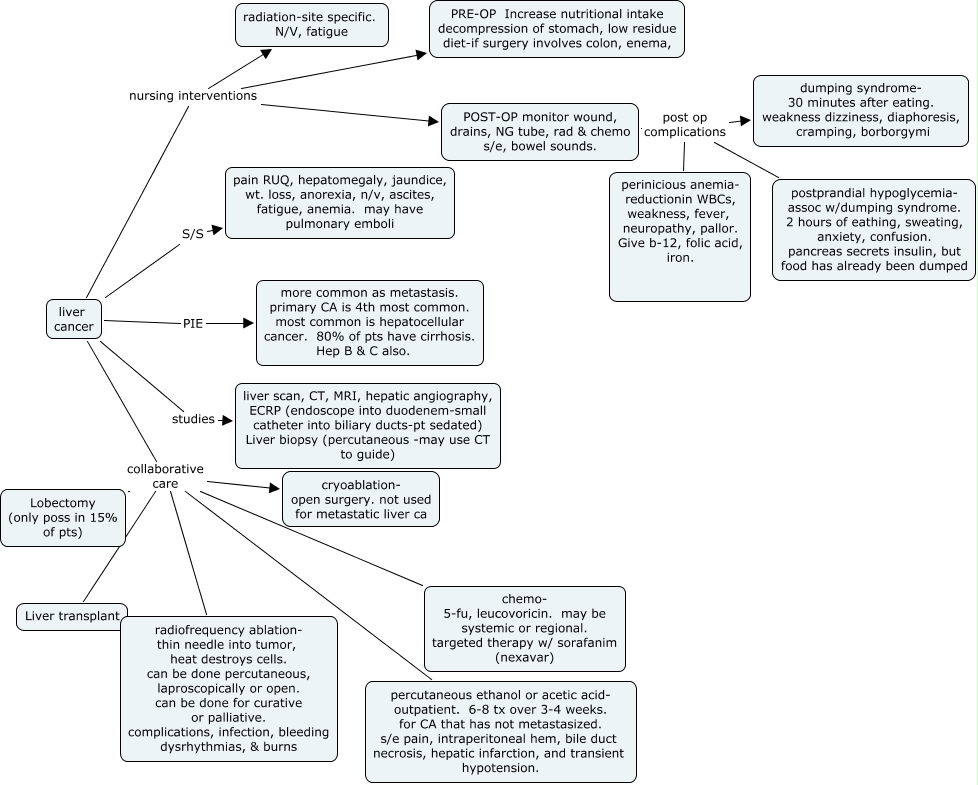 This Concept Map, created with IHMC CmapTools, has information related to: liver cancer, liver cancer nursing interventions radiation-site specific. N/V, fatigue, liver cancer nursing interventions POST-OP monitor wound, drains, NG tube, rad & chemo s/e, bowel sounds., liver cancer studies liver scan, CT, MRI, hepatic angiography, ECRP (endoscope into duodenem-small catheter into biliary ducts-pt sedated) Liver biopsy (percutaneous -may use CT to guide), POST-OP monitor wound, drains, NG tube, rad & chemo s/e, bowel sounds. post op complications postprandial hypoglycemia- assoc w/dumping syndrome. 2 hours of eathing, sweating, anxiety, confusion. pancreas secrets insulin, but food has already been dumped, liver cancer collaborative care percutaneous ethanol or acetic acid- outpatient. 6-8 tx over 3-4 weeks. for CA that has not metastasized. s/e pain, intraperitoneal hem, bile duct necrosis, hepatic infarction, and transient hypotension., POST-OP monitor wound, drains, NG tube, rad & chemo s/e, bowel sounds. post op complications perinicious anemia- reductionin WBCs, weakness, fever, neuropathy, pallor. Give b-12, folic acid, iron., liver cancer collaborative care Lobectomy (only poss in 15% of pts), liver cancer collaborative care radiofrequency ablation- thin needle into tumor, heat destroys cells. can be done percutaneous, laproscopically or open. can be done for curative or palliative. complications, infection, bleeding dysrhythmias, & burns, liver cancer collaborative care chemo- 5-fu, leucovoricin. may be systemic or regional. targeted therapy w/ sorafanim (nexavar), liver cancer collaborative care cryoablation- open surgery. not used for metastatic liver ca, liver cancer S/S pain RUQ, hepatomegaly, jaundice, wt. loss, anorexia, n/v, ascites, fatigue, anemia. may have pulmonary emboli, liver cancer collaborative care Liver transplant, liver cancer nursing interventions PRE-OP Increase nutritional intake decompression of stomach, low residue diet-if surgery involves colon, enema,, liver cancer PIE more common as metastasis. primary CA is 4th most common. most common is hepatocellular cancer. 80% of pts have cirrhosis. Hep B & C also., POST-OP monitor wound, drains, NG tube, rad & chemo s/e, bowel sounds. post op complications dumping syndrome- 30 minutes after eating. weakness dizziness, diaphoresis, cramping, borborgymi