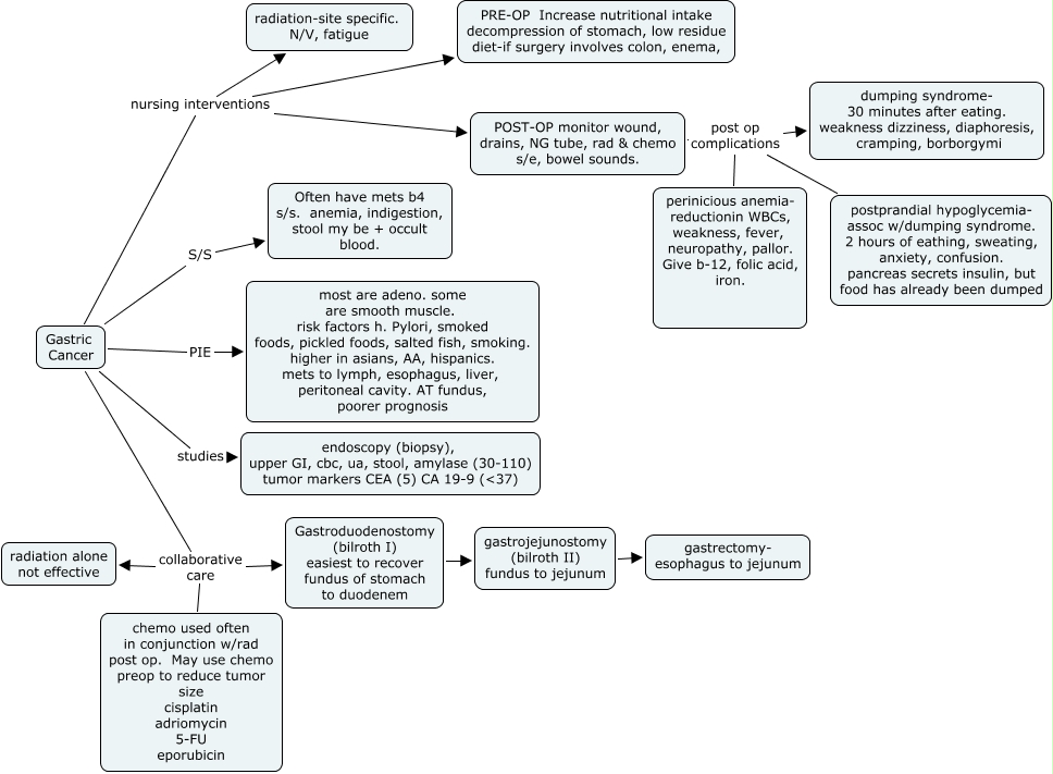 This Concept Map, created with IHMC CmapTools, has information related to: gastric cancer, Gastric Cancer nursing interventions radiation-site specific. N/V, fatigue, Gastric Cancer nursing interventions POST-OP monitor wound, drains, NG tube, rad & chemo s/e, bowel sounds., Gastric Cancer studies endoscopy (biopsy), upper GI, cbc, ua, stool, amylase (30-110) tumor markers CEA (5) CA 19-9 (ផ), POST-OP monitor wound, drains, NG tube, rad & chemo s/e, bowel sounds. post op complications postprandial hypoglycemia- assoc w/dumping syndrome. 2 hours of eathing, sweating, anxiety, confusion. pancreas secrets insulin, but food has already been dumped, POST-OP monitor wound, drains, NG tube, rad & chemo s/e, bowel sounds. post op complications perinicious anemia- reductionin WBCs, weakness, fever, neuropathy, pallor. Give b-12, folic acid, iron., Gastric Cancer collaborative care radiation alone not effective, Gastric Cancer collaborative care Gastroduodenostomy (bilroth I) easiest to recover fundus of stomach to duodenem, Gastroduodenostomy (bilroth I) easiest to recover fundus of stomach to duodenem gastrojejunostomy (bilroth II) fundus to jejunum, Gastric Cancer S/S Often have mets b4 s/s. anemia, indigestion, stool my be + occult blood., Gastric Cancer collaborative care chemo used often in conjunction w/rad post op. May use chemo preop to reduce tumor size cisplatin adriomycin 5-FU eporubicin, Gastric Cancer nursing interventions PRE-OP Increase nutritional intake decompression of stomach, low residue diet-if surgery involves colon, enema,, gastrojejunostomy (bilroth II) fundus to jejunum gastrectomy- esophagus to jejunum, Gastric Cancer PIE most are adeno. some are smooth muscle. risk factors h. Pylori, smoked foods, pickled foods, salted fish, smoking. higher in asians, AA, hispanics. mets to lymph, esophagus, liver, peritoneal cavity. AT fundus, poorer prognosis, POST-OP monitor wound, drains, NG tube, rad & chemo s/e, bowel sounds. post op complications dumping syndrome- 30 minutes after eating. weakness dizziness, diaphoresis, cramping, borborgymi