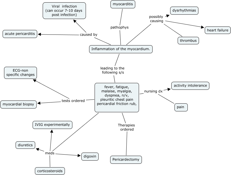 This Concept Map, created with IHMC CmapTools, has information related to: myocarditis, Inflammation of the myocardium. caused by Viral infection (can occur 7-10 days post infection), myocarditis pathophys Inflammation of the myocardium., Inflammation of the myocardium. possibly causing dysrhythmias, Inflammation of the myocardium. caused by acute pericarditis, fever, fatigue, malaise, myalgia, dyspnea, n/v, pleuritic chest pain pericardial friction rub, meds digoxin, fever, fatigue, malaise, myalgia, dyspnea, n/v, pleuritic chest pain pericardial friction rub, Therapies ordered Pericardectomy, Inflammation of the myocardium. leading to the following s/s fever, fatigue, malaise, myalgia, dyspnea, n/v, pleuritic chest pain pericardial friction rub,, fever, fatigue, malaise, myalgia, dyspnea, n/v, pleuritic chest pain pericardial friction rub, nursing dx pain, fever, fatigue, malaise, myalgia, dyspnea, n/v, pleuritic chest pain pericardial friction rub, meds IVIG experimentally, fever, fatigue, malaise, myalgia, dyspnea, n/v, pleuritic chest pain pericardial friction rub, meds diuretics, fever, fatigue, malaise, myalgia, dyspnea, n/v, pleuritic chest pain pericardial friction rub, tests ordered ECG-non specific changes, fever, fatigue, malaise, myalgia, dyspnea, n/v, pleuritic chest pain pericardial friction rub, meds corticosteroids, fever, fatigue, malaise, myalgia, dyspnea, n/v, pleuritic chest pain pericardial friction rub, tests ordered myocardial biopsy, Inflammation of the myocardium. possibly causing heart failure, fever, fatigue, malaise, myalgia, dyspnea, n/v, pleuritic chest pain pericardial friction rub, nursing dx activity intolerance, Inflammation of the myocardium. possibly causing thrombus