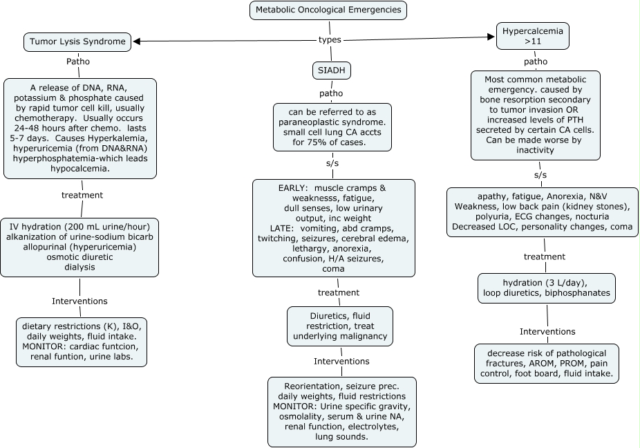 This Concept Map, created with IHMC CmapTools, has information related to: metabolic oncologic emergencies, can be referred to as paraneoplastic syndrome. small cell lung CA accts for 75% of cases. s/s EARLY: muscle cramps & weaknesss, fatigue, dull senses, low urinary output, inc weight LATE: vomiting, abd cramps, twitching, seizures, cerebral edema, lethargy, anorexia, confusion, H/A seizures, coma, Metabolic Oncological Emergencies types Tumor Lysis Syndrome, IV hydration (200 mL urine/hour) alkanization of urine-sodium bicarb allopurinal (hyperuricemia) osmotic diuretic dialysis Interventions dietary restrictions (K), I&O, daily weights, fluid intake. MONITOR: cardiac funtcion, renal funtion, urine labs., EARLY: muscle cramps & weaknesss, fatigue, dull senses, low urinary output, inc weight LATE: vomiting, abd cramps, twitching, seizures, cerebral edema, lethargy, anorexia, confusion, H/A seizures, coma treatment Diuretics, fluid restriction, treat underlying malignancy, Metabolic Oncological Emergencies types Hypercalcemia ᡃ, Most common metabolic emergency. caused by bone resorption secondary to tumor invasion OR increased levels of PTH secreted by certain CA cells. Can be made worse by inactivity s/s apathy, fatigue, Anorexia, N&V Weakness, low back pain (kidney stones), polyuria, ECG changes, nocturia Decreased LOC, personality changes, coma, apathy, fatigue, Anorexia, N&V Weakness, low back pain (kidney stones), polyuria, ECG changes, nocturia Decreased LOC, personality changes, coma treatment hydration (3 L/day), loop diuretics, biphosphanates, A release of DNA, RNA, potassium & phosphate caused by rapid tumor cell kill, usually chemotherapy. Usually occurs 24-48 hours after chemo. lasts 5-7 days. Causes Hyperkalemia, hyperuricemia (from DNA&RNA) hyperphosphatemia-which leads hypocalcemia. treatment IV hydration (200 mL urine/hour) alkanization of urine-sodium bicarb allopurinal (hyperuricemia) osmotic diuretic dialysis, Metabolic Oncological Emergencies types SIADH, Hypercalcemia ᡃ patho Most common metabolic emergency. caused by bone resorption secondary to tumor invasion OR increased levels of PTH secreted by certain CA cells. Can be made worse by inactivity, hydration (3 L/day), loop diuretics, biphosphanates Interventions decrease risk of pathological fractures, AROM, PROM, pain control, foot board, fluid intake., Diuretics, fluid restriction, treat underlying malignancy Interventions Reorientation, seizure prec. daily weights, fluid restrictions MONITOR: Urine specific gravity, osmolality, serum & urine NA, renal function, electrolytes, lung sounds., SIADH patho can be referred to as paraneoplastic syndrome. small cell lung CA accts for 75% of cases., Tumor Lysis Syndrome Patho A release of DNA, RNA, potassium & phosphate caused by rapid tumor cell kill, usually chemotherapy. Usually occurs 24-48 hours after chemo. lasts 5-7 days. Causes Hyperkalemia, hyperuricemia (from DNA&RNA) hyperphosphatemia-which leads hypocalcemia.