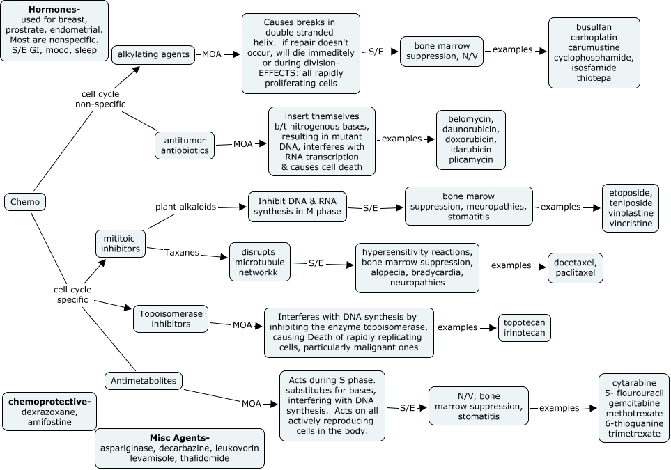 This Concept Map, created with IHMC CmapTools, has information related to: chemo drugs, Chemo cell cycle non-specific alkylating agents, Chemo cell cycle specific Topoisomerase inhibitors, Inhibit DNA & RNA synthesis in M phase S/E bone marow suppression, meuropathies, stomatitis, mititoic inhibitors Taxanes disrupts microtubule networkk, Chemo cell cycle specific mititoic inhibitors, disrupts microtubule networkk S/E hypersensitivity reactions, bone marrow suppression, alopecia, bradycardia, neuropathies, Acts during S phase. substitutes for bases, interfering with DNA synthesis. Acts on all actively reproducing cells in the body. S/E N/V, bone marrow suppression, stomatitis, N/V, bone marrow suppression, stomatitis examples cytarabine 5- flourouracil gemcitabine methotrexate 6-thioguanine trimetrexate, Chemo cell cycle non-specific antitumor antiobiotics, mititoic inhibitors plant alkaloids Inhibit DNA & RNA synthesis in M phase, bone marrow suppression, N/V examples busulfan carboplatin carumustine cyclophosphamide, isosfamide thiotepa, insert themselves b/t nitrogenous bases, resulting in mutant DNA, interferes with RNA transcription & causes cell death examples belomycin, daunorubicin, doxorubicin, idarubicin plicamycin, Topoisomerase inhibitors MOA Interferes with DNA synthesis by inhibiting the enzyme topoisomerase, causing Death of rapidly replicating cells, particularly malignant ones, hypersensitivity reactions, bone marrow suppression, alopecia, bradycardia, neuropathies examples docetaxel, paclitaxel, bone marow suppression, meuropathies, stomatitis examples etoposide, teniposide vinblastine vincristine, antitumor antiobiotics MOA insert themselves b/t nitrogenous bases, resulting in mutant DNA, interferes with RNA transcription & causes cell death, Antimetabolites MOA Acts during S phase. substitutes for bases, interfering with DNA synthesis. Acts on all actively reproducing cells in the body., Causes breaks in double stranded helix. if repair doesn't occur, will die immeditely or during division- EFFECTS: all rapidly proliferating cells S/E bone marrow suppression, N/V, Chemo cell cycle specific Antimetabolites, alkylating agents MOA Causes breaks in double stranded helix. if repair doesn't occur, will die immeditely or during division- EFFECTS: all rapidly proliferating cells