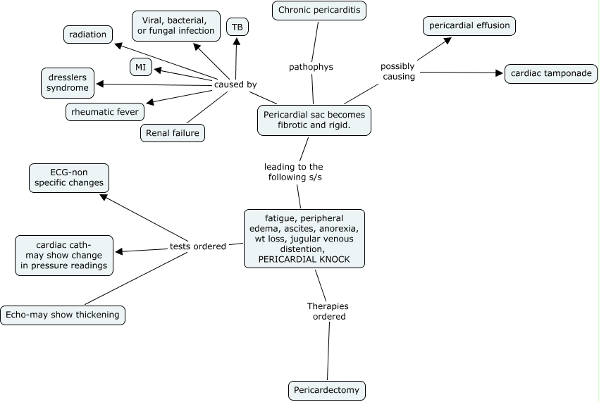 This Concept Map, created with IHMC CmapTools, has information related to: chronic pericarditis, fatigue, peripheral edema, ascites, anorexia, wt loss, jugular venous distention, PERICARDIAL KNOCK Therapies ordered Pericardectomy, fatigue, peripheral edema, ascites, anorexia, wt loss, jugular venous distention, PERICARDIAL KNOCK tests ordered ECG-non specific changes, fatigue, peripheral edema, ascites, anorexia, wt loss, jugular venous distention, PERICARDIAL KNOCK tests ordered cardiac cath- may show change in pressure readings, Pericardial sac becomes fibrotic and rigid. leading to the following s/s fatigue, peripheral edema, ascites, anorexia, wt loss, jugular venous distention, PERICARDIAL KNOCK, Pericardial sac becomes fibrotic and rigid. caused by MI, Pericardial sac becomes fibrotic and rigid. caused by rheumatic fever, Pericardial sac becomes fibrotic and rigid. caused by TB, Pericardial sac becomes fibrotic and rigid. caused by Viral, bacterial, or fungal infection, fatigue, peripheral edema, ascites, anorexia, wt loss, jugular venous distention, PERICARDIAL KNOCK tests ordered Echo-may show thickening, Pericardial sac becomes fibrotic and rigid. possibly causing pericardial effusion, Pericardial sac becomes fibrotic and rigid. possibly causing cardiac tamponade, Pericardial sac becomes fibrotic and rigid. caused by dresslers syndrome, Pericardial sac becomes fibrotic and rigid. caused by Renal failure, Chronic pericarditis pathophys Pericardial sac becomes fibrotic and rigid., Pericardial sac becomes fibrotic and rigid. caused by radiation