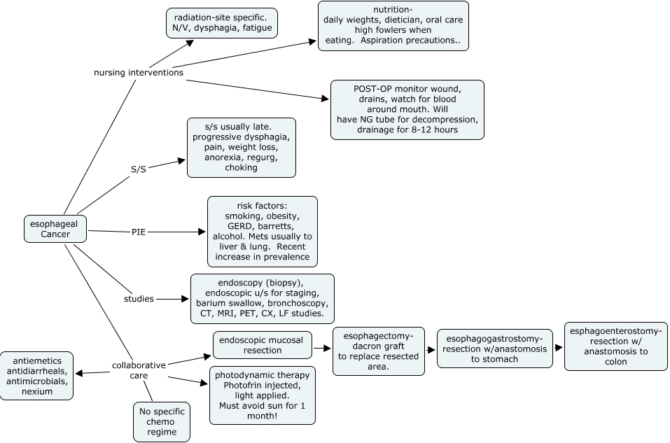 This Concept Map, created with IHMC CmapTools, has information related to: esophageal cancer, esophagogastrostomy- resection w/anastomosis to stomach esphagoenterostomy- resection w/ anastomosis to colon, esophageal Cancer studies endoscopy (biopsy), endoscopic u/s for staging, barium swallow, bronchoscopy, CT, MRI, PET, CX, LF studies., esophageal Cancer nursing interventions POST-OP monitor wound, drains, watch for blood around mouth. Will have NG tube for decompression, drainage for 8-12 hours, esophageal Cancer nursing interventions radiation-site specific. N/V, dysphagia, fatigue, esophageal Cancer collaborative care endoscopic mucosal resection, esophageal Cancer collaborative care No specific chemo regime, endoscopic mucosal resection esophagectomy- dacron graft to replace resected area., esophageal Cancer collaborative care photodynamic therapy Photofrin injected, light applied. Must avoid sun for 1 month!, esophageal Cancer S/S s/s usually late. progressive dysphagia, pain, weight loss, anorexia, regurg, choking, esophagectomy- dacron graft to replace resected area. esophagogastrostomy- resection w/anastomosis to stomach, esophageal Cancer nursing interventions nutrition- daily wieghts, dietician, oral care high fowlers when eating. Aspiration precautions.., esophageal Cancer collaborative care antiemetics antidiarrheals, antimicrobials, nexium, esophageal Cancer PIE risk factors: smoking, obesity, GERD, barretts, alcohol. Mets usually to liver & lung. Recent increase in prevalence