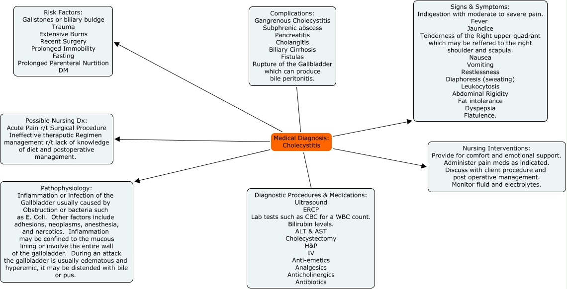 This Concept Map, created with IHMC CmapTools, has information related to: Cholecystitis, Complications: Gangrenous Cholecystitis Subphrenic abscess Pancreatitis Cholangitis Biliary Cirrhosis Fistulas Rupture of the Gallbladder which can produce bile peritonitis. Medical Diagnosis: Cholecystitis Signs & Symptoms: Indigestion with moderate to severe pain. Fever Jaundice Tenderness of the Right upper quadrant which may be reffered to the right shoulder and scapula. Nausea Vomiting Restlessness Diaphoresis (sweating) Leukocytosis Abdominal Rigidity Fat intolerance Dyspepsia Flatulence., Complications: Gangrenous Cholecystitis Subphrenic abscess Pancreatitis Cholangitis Biliary Cirrhosis Fistulas Rupture of the Gallbladder which can produce bile peritonitis. Medical Diagnosis: Cholecystitis Nursing Interventions: Provide for comfort and emotional support. Administer pain meds as indicated. Discuss with client procedure and post operative management. Monitor fluid and electrolytes., Complications: Gangrenous Cholecystitis Subphrenic abscess Pancreatitis Cholangitis Biliary Cirrhosis Fistulas Rupture of the Gallbladder which can produce bile peritonitis. Medical Diagnosis: Cholecystitis Risk Factors: Gallstones or biliary buldge Trauma Extensive Burns Recent Surgery Prolonged Immobility Fasting Prolonged Parenteral Nurtition DM, Complications: Gangrenous Cholecystitis Subphrenic abscess Pancreatitis Cholangitis Biliary Cirrhosis Fistulas Rupture of the Gallbladder which can produce bile peritonitis. Medical Diagnosis: Cholecystitis Pathophysiology: Inflammation or infection of the Gallbladder usually caused by Obstruction or bacteria such as E. Coli. Other factors include adhesions, neoplasms, anesthesia, and narcotics. Inflammation may be confined to the mucous lining or involve the entire wall of the gallbladder. During an attack the gallbladder is usually edematous and hyperemic, it may be distended with bile or pus., Complications: Gangrenous Cholecystitis Subphrenic abscess Pancreatitis Cholangitis Biliary Cirrhosis Fistulas Rupture of the Gallbladder which can produce bile peritonitis. Medical Diagnosis: Cholecystitis Possible Nursing Dx: Acute Pain r/t Surgical Procedure Ineffective theraputic Regimen management r/t lack of knowledge of diet and postoperative management., Complications: Gangrenous Cholecystitis Subphrenic abscess Pancreatitis Cholangitis Biliary Cirrhosis Fistulas Rupture of the Gallbladder which can produce bile peritonitis. Medical Diagnosis: Cholecystitis Diagnostic Procedures & Medications: Ultrasound ERCP Lab tests such as CBC for a WBC count. Bilirubin levels. ALT & AST Cholecystectomy H&P IV Anti-emetics Analgesics Anticholinergics Antibiotics