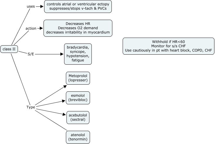 This Concept Map, created with IHMC CmapTools, has information related to: Class II, class II S/E bradycardia, syncope, hypotension, fatigue, class II uses controls atrial or ventricular ectopy suppresses/stops v-tach & PVCs, class II Type atenolol (tenormin), class II Type acebutolol (sectral), class II action Decreases HR Decreases O2 demand decreases irritability in myocardium, class II Type esmolol (brevibloc), class II Type Metoprolol (lopresser)