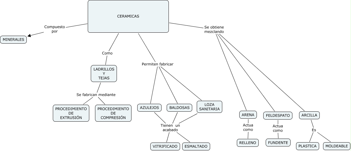 Este Cmap, tiene información relacionada con: CERAMICAS, AZULEJOS Tienen un acabado ESMALTADO, CERAMICAS Se obtiene mezclando ARENA, LOZA SANITARIA Tienen un acabado VITRIFICADO, CERAMICAS Permiten fabricar AZULEJOS, LADRILLOS Y TEJAS Se fabrican mediante PROCEDIMIENTO DE COMPRESIÓN, CERAMICAS Como LADRILLOS Y TEJAS, LOZA SANITARIA Tienen un acabado ESMALTADO, ARENA Actua como RELLENO, AZULEJOS Tienen un acabado VITRIFICADO, LADRILLOS Y TEJAS Se fabrican mediante PROCEDIMIENTO DE EXTRUSIÓN, CERAMICAS Permiten fabricar LOZA SANITARIA, BALDOSAS Tienen un acabado ESMALTADO, ARCILLA Es MOLDEABLE, CERAMICAS Se obtiene mezclando ARCILLA, CERAMICAS Permiten fabricar BALDOSAS, FELDESPATO Actua como FUNDENTE, CERAMICAS Compuesto por MINERALES, BALDOSAS Tienen un acabado VITRIFICADO, ARCILLA Es PLASTICA, CERAMICAS Se obtiene mezclando FELDESPATO