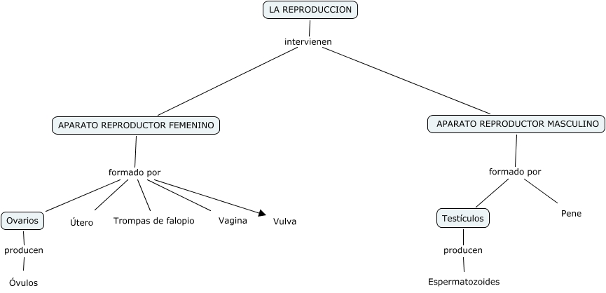 Este Cmap, tiene información relacionada con: LA REPRODUCCIÓN.Manuel,Jorge y Rubén, Testículos producen Espermatozoides, APARATO REPRODUCTOR MASCULINO formado por Testículos, APARATO REPRODUCTOR FEMENINO formado por Vulva, LA REPRODUCCION intervienen APARATO REPRODUCTOR MASCULINO, APARATO REPRODUCTOR FEMENINO formado por Vagina, APARATO REPRODUCTOR FEMENINO formado por Útero, APARATO REPRODUCTOR FEMENINO formado por Trompas de falopio, APARATO REPRODUCTOR FEMENINO formado por Ovarios, Ovarios producen Óvulos, LA REPRODUCCION intervienen APARATO REPRODUCTOR FEMENINO, APARATO REPRODUCTOR MASCULINO formado por Pene