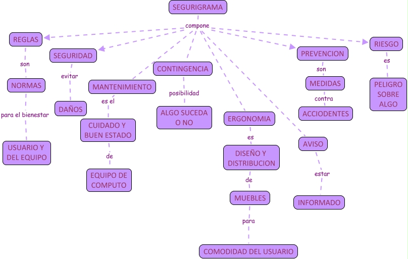 Este Cmap, tiene información relacionada con: segurigramas, SEGURIGRAMA compone PREVENCION, MUEBLES para COMODIDAD DEL USUARIO, SEGURIDAD evitar DAÑOS, CONTINGENCIA posibilidad ALGO SUCEDA O NO, SEGURIGRAMA compone MANTENIMIENTO, DISEÑO Y DISTRIBUCION de MUEBLES, ERGONOMIA es DISEÑO Y DISTRIBUCION, SEGURIGRAMA compone RIESGO, CUIDADO Y BUEN ESTADO de EQUIPO DE COMPUTO, SEGURIGRAMA compone AVISO, NORMAS para el bienestar USUARIO Y DEL EQUIPO, SEGURIGRAMA compone REGLAS, PREVENCION son MEDIDAS, SEGURIGRAMA compone SEGURIDAD, REGLAS son NORMAS, AVISO estar INFORMADO, MANTENIMIENTO es el CUIDADO Y BUEN ESTADO, MEDIDAS contra ACCIODENTES, SEGURIGRAMA compone ERGONOMIA, SEGURIGRAMA compone CONTINGENCIA