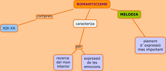 Este Cmap, tiene información relacionada con: tema 4 romanticisme, ROMANTICISME ???? MELODIA, ROMANTICISME ???? caracteriza, MELODIA ???? element d´expressió mes important, caracteriza per recerca del mon interior, ROMANTICISME compren XIX-XX, caracteriza per expressió de les emocions
