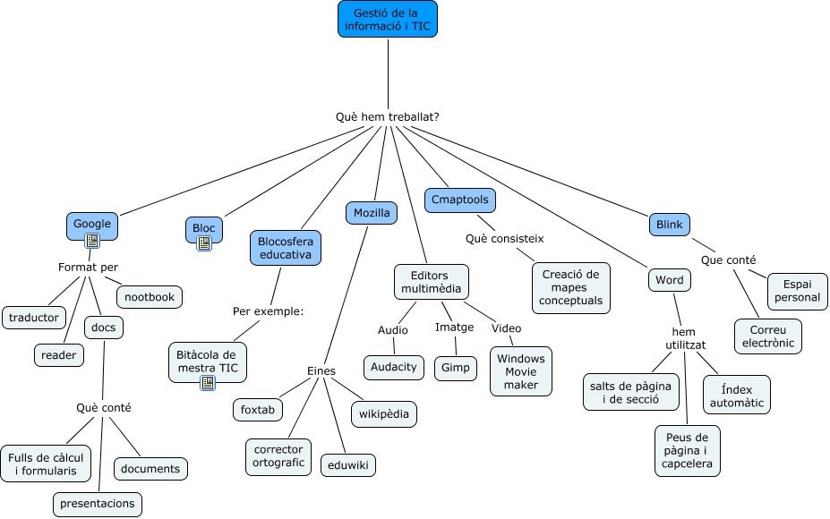 Aquest mapa conceptual conté informació relacionada amb: Mapa conceptual, Blink Que conté Correu electrònic, Google Format per traductor, Gestió de la informació i TIC Què hem treballat? Mozilla, Editors multimèdia Imatge Gimp, Word hem utilitzat salts de pàgina i de secció, Editors multimèdia Video Windows Movie maker, Word hem utilitzat Índex automàtic, Mozilla Eines corrector ortografic, docs Què conté presentacions, Word hem utilitzat Peus de pàgina i capcelera, docs Què conté Fulls de càlcul i formularis, Mozilla Eines eduwiki, Gestió de la informació i TIC Què hem treballat? Blink, Google Format per docs, Gestió de la informació i TIC Què hem treballat? Word, Gestió de la informació i TIC Què hem treballat? Cmaptools, Gestió de la informació i TIC Què hem treballat? Google, Mozilla Eines wikipèdia, Google Format per nootbook, Cmaptools Què consisteix Creació de mapes conceptuals