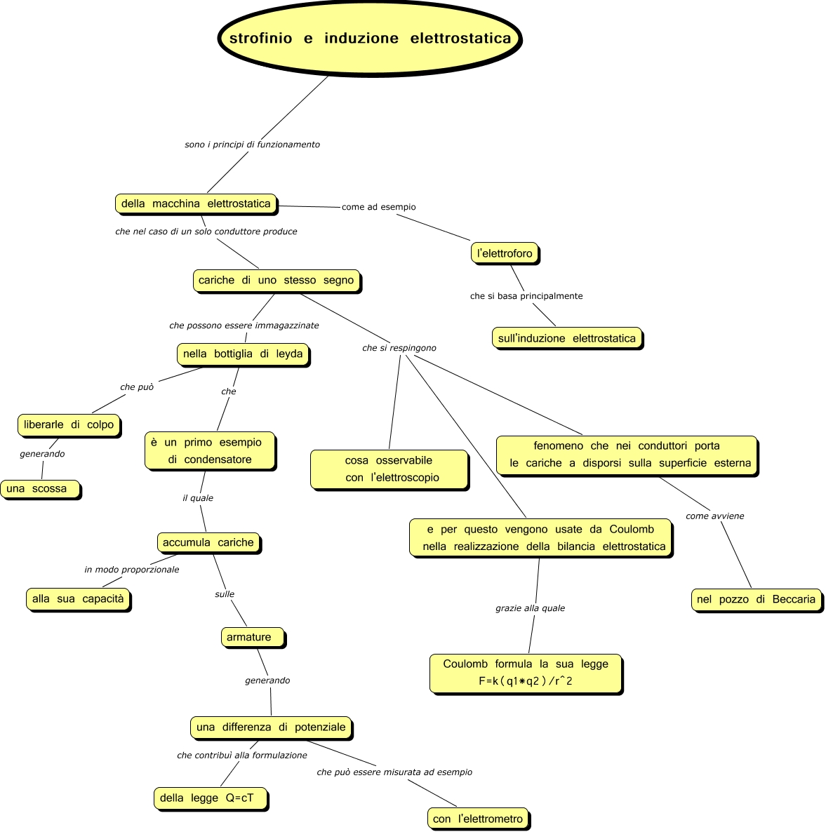 Questa Cmap, creata con IHMC CmapTools, contiene informazioni relative a: induzione elettrostatica 2, cariche di uno stesso segno che si respingono fenomeno che nei conduttori porta le cariche a disporsi sulla superficie esterna, una differenza di potenziale che può essere misurata ad esempio con l'elettrometro, della macchina elettrostatica che nel caso di un solo conduttore produce cariche di uno stesso segno, nella bottiglia di leyda che può liberarle di colpo, accumula cariche sulle armature, liberarle di colpo generando una scossa, accumula cariche in modo proporzionale alla sua capacità, strofinio e induzione elettrostatica sono i principi di funzionamento della macchina elettrostatica, è un primo esempio di condensatore il quale accumula cariche, armature generando una differenza di potenziale, l'elettroforo che si basa principalmente sull'induzione elettrostatica, cariche di uno stesso segno che possono essere immagazzinate nella bottiglia di leyda, nella bottiglia di leyda che è un primo esempio di condensatore, cariche di uno stesso segno che si respingono e per questo vengono usate da Coulomb nella realizzazione della bilancia elettrostatica, fenomeno che nei conduttori porta le cariche a disporsi sulla superficie esterna come avviene nel pozzo di Beccaria, della macchina elettrostatica come ad esempio l'elettroforo, e per questo vengono usate da Coulomb nella realizzazione della bilancia elettrostatica grazie alla quale Coulomb formula la sua legge F=k(q1*q2)/r^2, una differenza di potenziale che contribuì alla formulazione della legge Q=cT, cariche di uno stesso segno che si respingono cosa osservabile con l'elettroscopio