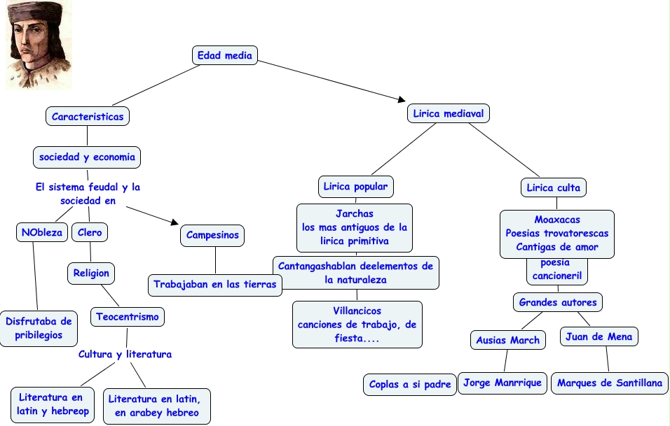 Este Cmap, tiene información relacionada con: Sin Título 1, Moaxacas Poesias trovatorescas Cantigas de amor ???? poesia cancioneril, Lirica popular ???? Jarchas los mas antiguos de la lirica primitiva, Grandes autores ???? Juan de Mena, sociedad y economia El sistema feudal y la sociedad en Campesinos, poesia cancioneril ???? Grandes autores, Teocentrismo Cultura y literatura Literatura en latin, en arabey hebreo, Clero ???? Religion, NObleza ???? Disfrutaba de pribilegios, Caracteristicas ???? sociedad y economia, Campesinos ???? Trabajaban en las tierras, Teocentrismo Cultura y literatura Literatura en latin y hebreop, Lirica mediaval ???? Lirica popular, sociedad y economia El sistema feudal y la sociedad en Clero, sociedad y economia El sistema feudal y la sociedad en NObleza, Jorge Manrrique ???? Coplas a si padre, Lirica mediaval ???? Lirica culta, Ausias March ???? Jorge Manrrique, Religion ???? Teocentrismo, Cantangashablan deelementos de la naturaleza ???? Villancicos canciones de trabajo, de fiesta...., Juan de Mena ???? Marques de Santillana