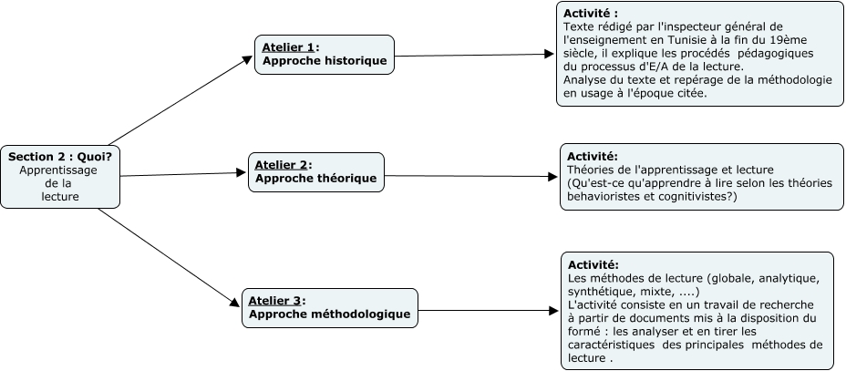 This Concept Map, created with IHMC CmapTools, has information related to: Plan de la formation(Section 2), Section 2 : Quoi? Apprentissage de la lecture ???? Atelier 3: Approche méthodologique, Section 2 : Quoi? Apprentissage de la lecture ???? Atelier 1: Approche historique, Atelier 1: Approche historique ???? Activité : Texte rédigé par l'inspecteur général de l'enseignement en Tunisie à la fin du 19ème siècle, il explique les procédés pédagogiques du processus d'E/A de la lecture. Analyse du texte et repérage de la méthodologie en usage à l'époque citée., Section 2 : Quoi? Apprentissage de la lecture ???? Atelier 2: Approche théorique, Atelier 3: Approche méthodologique ???? Activité: Les méthodes de lecture (globale, analytique, synthétique, mixte, ....) L'activité consiste en un travail de recherche à partir de documents mis à la disposition du formé : les analyser et en tirer les caractéristiques des principales méthodes de lecture ., Atelier 2: Approche théorique ???? Activité: Théories de l'apprentissage et lecture (Qu'est-ce qu'apprendre à lire selon les théories behavioristes et cognitivistes?)