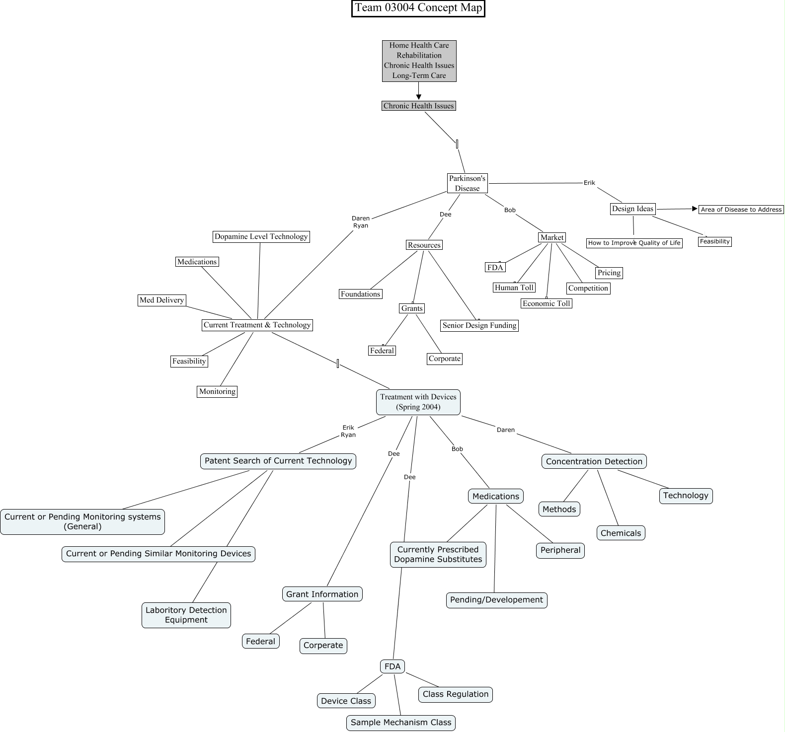 Questa Cmap, creata con IHMC CmapTools, contiene informazioni relative a: 03004 Spring 2010 Concept Map, Design Ideas Feasibility, Medications Currently Prescribed Dopamine Substitutes, FDA Sample Mechanism Class, Parkinson's Disease Dee Resources, Current Treatment & Technology Feasibility, Design Ideas How to Improve Quality of Life, Market Human Toll, FDA Class Regulation, Current Treatment & Technology Monitoring, Market Economic Toll, Parkinson's Disease Daren Ryan Current Treatment & Technology, Current Treatment & Technology Medications, Treatment with Devices (Spring 2004) Bob Medications, Current Treatment & Technology Med Delivery, Resources Foundations, Resources Senior Design Funding, Grants Federal, Design Ideas Area of Disease to Address, Current Treatment & Technology Treatment with Devices (Spring 2004), Current Treatment & Technology Dopamine Level Technology
