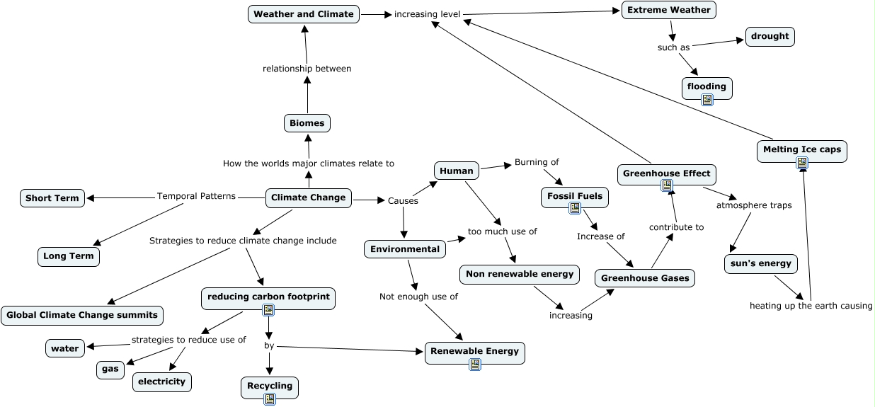 This Concept Map, created with IHMC CmapTools, has information related to: Climate Change, Climate Change Temporal Patterns Short Term, Climate Change Strategies to reduce climate change include reducing carbon footprint, reducing carbon footprint strategies to reduce use of water, reducing carbon footprint strategies to reduce use of electricity, Greenhouse Effect atmosphere traps sun's energy, Climate Change How the worlds major climates relate to Biomes, Greenhouse Effect increasing level Extreme Weather, Extreme Weather such as drought, Extreme Weather such as flooding, Weather and Climate increasing level Extreme Weather, Climate Change Causes Environmental, Climate Change Causes Human, Climate Change Strategies to reduce climate change include Global Climate Change summits, Melting Ice caps increasing level Extreme Weather, Human too much use of Non renewable energy, Climate Change Temporal Patterns Long Term, Non renewable energy increasing Greenhouse Gases, Environmental too much use of Non renewable energy, sun's energy heating up the earth causing Melting Ice caps, Biomes relationship between Weather and Climate