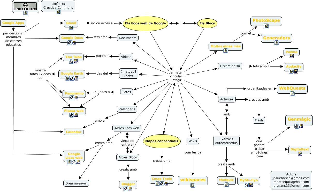Este Cmap, tiene información relacionada con: TIC i TAC, Els llocs web de Google permeten vincular i afegir Fotos, Google Earth mostra fotos i videos de You Tube, Els llocs web de Google permeten vincular i afegir Fitxers de so, Google Apps per gestionar membres de centres educatius Calendar, Flash que podem trobar en pàgines com Digitaltext, Fotos pujades a Picasa web, Els Blocs permeten vincular i afegir Wikis, Altres llocs web creats amb Dreamweaver, Els Blocs permeten vincular i afegir Activitas, Els Blocs permeten vincular i afegir Mapes conceptuals, Fotos pujades a Panoramio, Fitxers de so fets amb l' Audacity, Els llocs web de Google permeten vincular i afegir Moltes eines més, Els llocs web de Google permeten vincular i afegir Documents, Google Earth mostra fotos i videos de Panoramio, Gmail inclou accés a Els llocs web de Google, Els llocs web de Google permeten vincular i afegir Imatges i videos, Els Blocs permeten vincular i afegir Fitxers de so, Altres llocs web vinculats entre sí Altres Blocs, Els Blocs permeten vincular i afegir calendaris