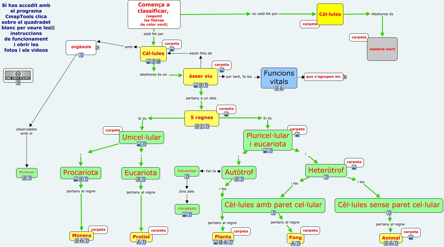 Este Cmap, tiene información relacionada con: Classificacio _dels_essers_vius, Funcions vitals Per formar nous éssers vius La reproducció, 5 regnes Si és Pluricel·lular i eucariota, Cèl·lules amb paret cel·lular pertany al regne Planta, 5 regnes Si és Unicel·lular, orgànuls com la Membrana cel·lular, Comença a classificar, (seguint les fletxes de color verd) no està fet per Cèl·lules, Membrana cel·lular el Citoplasma, Heteròtrof i les Cèl·lules sense paret cel·lular, Funcions vitals per comunicar-se amb l'exterior La relació, Cèl·lules Aleshores és matèria inert, Funcions vitals per mantenir-se viu La Nutrició, Autòtrof fan la Fotosíntesi, Heteròtrof i les Cèl·lules amb paret cel·lular, Comença a classificar, (seguint les fletxes de color verd) està fet per Cèl·lules, Citoplasma el Nucli cel·lular, Unicel·lular i Procariota, ésser viu estan fets de Cèl·lules, Unicel·lular i Eucariota, Cèl·lules aleshores és un ésser viu, ésser viu per tant, fa les Funcions vitals