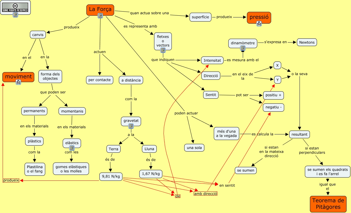 Este Cmap, tiene información relacionada con: Forca, La Força actuen a distància, plàstics com la Plastilina o el fang, La Força produeix canvis, forma dels objectes que poden ser momentanis, se sumen els quadrats i es fa l'arrel igual que el Teorema de Pitàgores, forma dels objectes que poden ser permanents, Intensitat es mesura amb el dinamòmetre, a distància com la gravetat, Direcció en el eix de la X, 1,67 N/kg en sentit negatiu -, Y o la seva resultant, més d'una a la vegada es calcula la resultant, 9,81 N/kg amb direcció Y, X o la seva resultant, resultant si estan perpendiculars se sumen els quadrats i es fa l'arrel, 9,81 N/kg en sentit negatiu -, fletxes o vectors que indiquen Sentit, La Força poden actuar una sola, Sentit pot ser positiu +, fletxes o vectors que indiquen Direcció