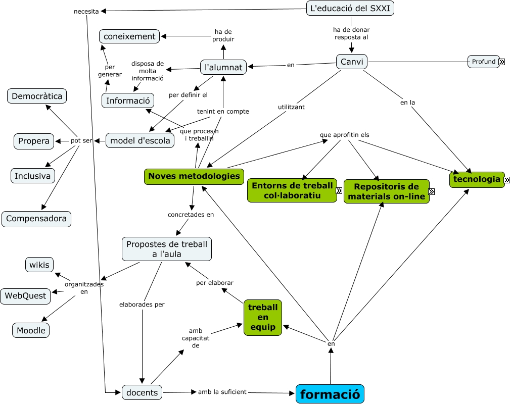 Este Cmap, tiene información relacionada con: Formació escola 2.0, Noves metodologies que aprofitin els tecnologia, l'alumnat per definir el model d'escola, Entorns de treball col·laboratiu com CmapTools, Entorns de treball col·laboratiu com Google docs, formació en Repositoris de materials on-line, tecnologia com Ordinadors, model d'escola pot ser Compensadora, L'educació del SXXI necesita docents, Noves metodologies tenint en compte model d'escola, Noves metodologies concretades en Propostes de treball a l'aula, formació en treball en equip, Propostes de treball a l'aula elaborades per docents, Propostes de treball a l'aula organitzades en WebQuest, profund en molts àmbits, Repositoris de materials on-line en jClic, Canvi que es presenta profund, Imprevisible en molts àmbits, Noves metodologies tenint en compte l'alumnat, Canvi que es presenta Imprevisible, Repositoris de materials on-line en Thatquiz