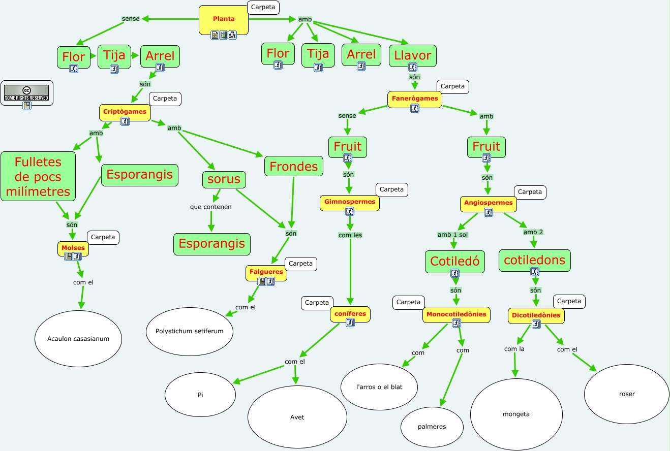 Este Cmap, tiene información relacionada con: plantes, Planta amb Tija, Falgueres com el Polystichum setiferum, Frondes són Falgueres, coníferes com el Avet, Criptògames amb sorus, cotiledons són Dicotiledònies, Gimnospermes com les coníferes, Fruit són Gimnospermes, Criptògames amb Esporangis, sorus que contenen Esporangis, Monocotiledònies com l'arros o el blat, Fulletes de pocs milímetres són Molses, Arrel són Criptògames, Angiospermes amb 2 cotiledons, Angiospermes amb 1 sol Cotiledó, Tija Arrel, Criptògames amb Fulletes de pocs milímetres, Planta amb Flor, Planta amb Llavor, Llavor són Fanerògames