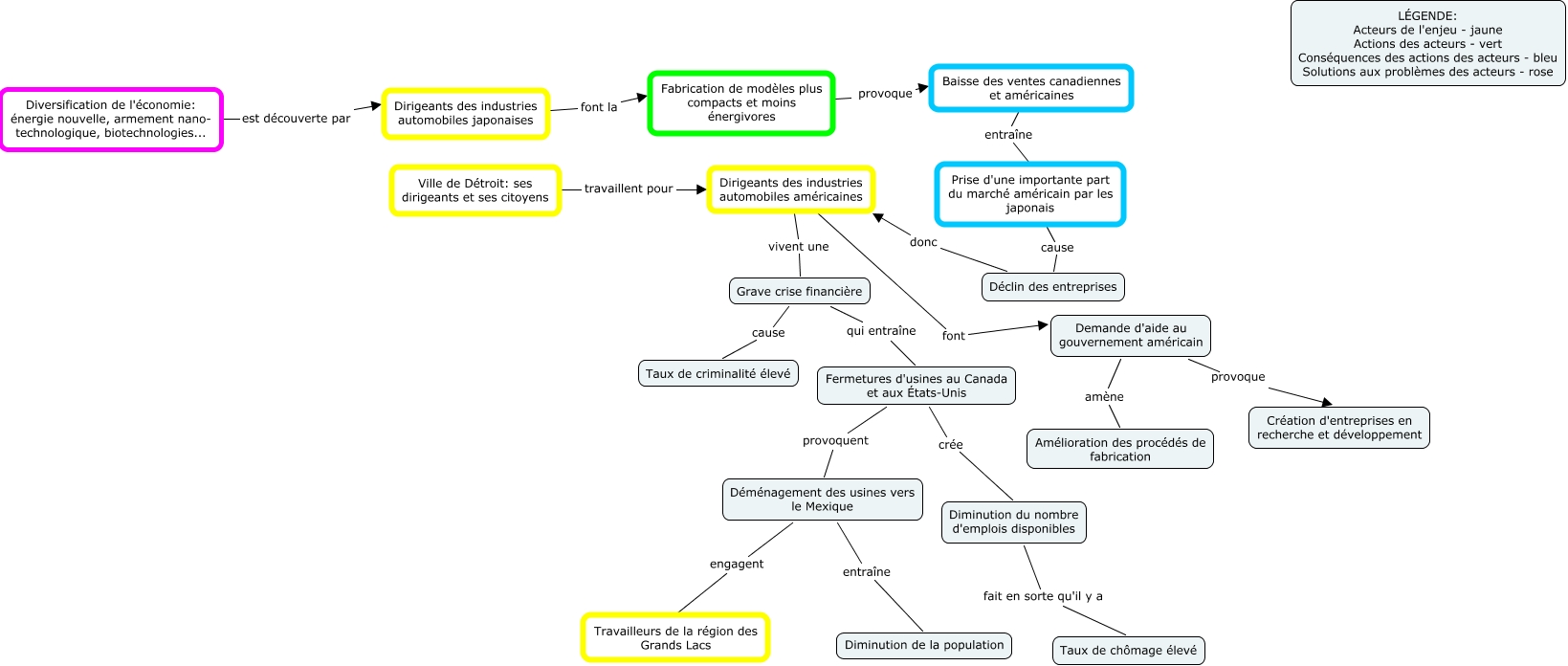 Cette carte conceptuelle, cree avec IHMC CmapTools, contient des informations liees a : enjeu territorial - industries automobiles, Dirigeants des industries automobiles américaines vivent une Grave crise financière, Dirigeants des industries automobiles américaines font Demande d'aide au gouvernement américain, Prise d'une importante part du marché américain par les japonais cause Déclin des entreprises, Déclin des entreprises donc Dirigeants des industries automobiles américaines, Baisse des ventes canadiennes et américaines entraîne Prise d'une importante part du marché américain par les japonais