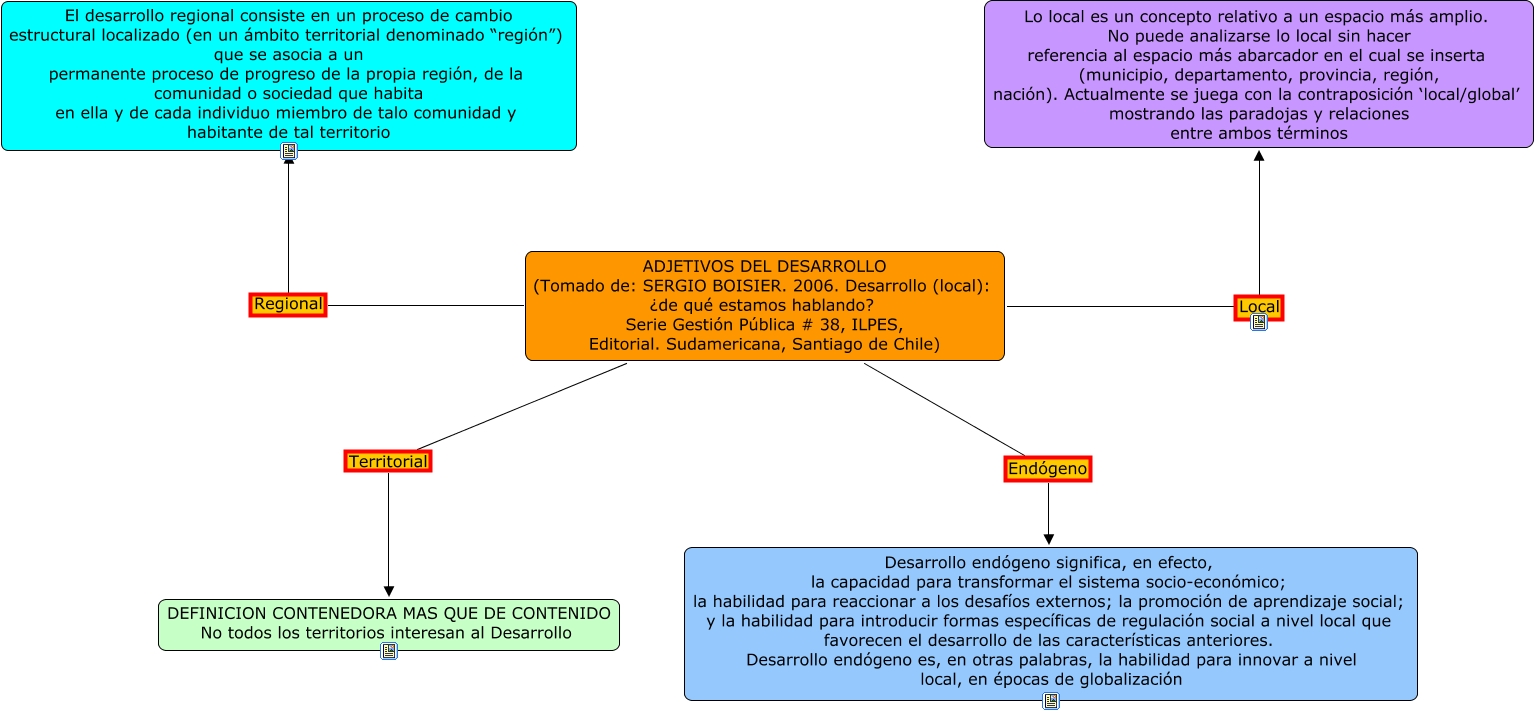 Este Cmap, tiene información relacionada con: Adjetivos del Desarrollo, ADJETIVOS DEL DESARROLLO (Tomado de: SERGIO BOISIER. 2006. Desarrollo (local): ¿de qué estamos hablando? Serie Gestión Pública # 38, ILPES, Editorial. Sudamericana, Santiago de Chile) Regional El desarrollo regional consiste en un proceso de cambio estructural localizado (en un ámbito territorial denominado “región”) que se asocia a un permanente proceso de progreso de la propia región, de la comunidad o sociedad que habita en ella y de cada individuo miembro de talo comunidad y habitante de tal territorio, ADJETIVOS DEL DESARROLLO (Tomado de: SERGIO BOISIER. 2006. Desarrollo (local): ¿de qué estamos hablando? Serie Gestión Pública # 38, ILPES, Editorial. Sudamericana, Santiago de Chile) Local Lo local es un concepto relativo a un espacio más amplio. No puede analizarse lo local sin hacer referencia al espacio más abarcador en el cual se inserta (municipio, departamento, provincia, región, nación). Actualmente se juega con la contraposición ‘local/global’ mostrando las paradojas y relaciones entre ambos términos, ADJETIVOS DEL DESARROLLO (Tomado de: SERGIO BOISIER. 2006. Desarrollo (local): ¿de qué estamos hablando? Serie Gestión Pública # 38, ILPES, Editorial. Sudamericana, Santiago de Chile) Endógeno Desarrollo endógeno significa, en efecto, la capacidad para transformar el sistema socio-económico; la habilidad para reaccionar a los desafíos externos; la promoción de aprendizaje social; y la habilidad para introducir formas específicas de regulación social a nivel local que favorecen el desarrollo de las características anteriores. Desarrollo endógeno es, en otras palabras, la habilidad para innovar a nivel local, en épocas de globalización, ADJETIVOS DEL DESARROLLO (Tomado de: SERGIO BOISIER. 2006. Desarrollo (local): ¿de qué estamos hablando? Serie Gestión Pública # 38, ILPES, Editorial. Sudamericana, Santiago de Chile) Territorial DEFINICION CONTENEDORA MAS QUE DE CONTENIDO No todos los territorios interesan al Desarrollo