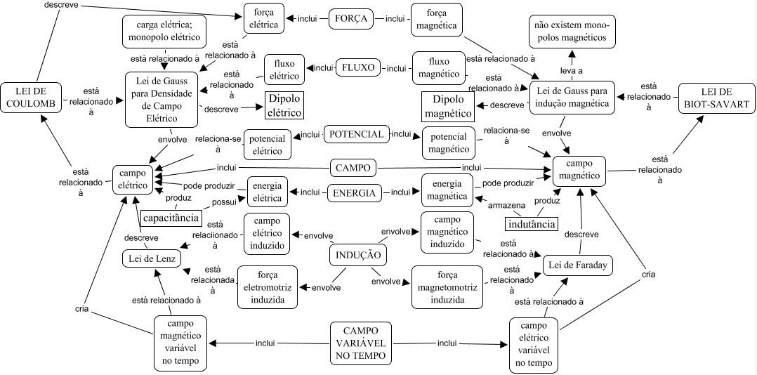 Esse mapa conceitual, produzido no IHMC CmapTools, tem a informação relacionada a: campos2, FORÇA inclui força elétrica, campo magnético variável no tempo cria campo elétrico, LEI DE COULOMB está relacionado à Lei de Gauss para Densidade de Campo Elétrico, campo elétrico está relacionado à LEI DE COULOMB, carga elétrica; monopolo elétrico está relacionado à Lei de Gauss para Densidade de Campo Elétrico, INDUÇÃO envolve campo magnético induzido, INDUÇÃO envolve força eletromotriz induzida, FLUXO inclui fluxo magnético, Lei de Gauss para indução magnética envolve campo magnético, força eletromotriz induzida está relacionada à Lei de Lenz, indutância armazena energia magnética, INDUÇÃO envolve campo elétrico induzido, CAMPO VARIÁVEL NO TEMPO inclui campo magnético variável no tempo, força elétrica está relacionado à Lei de Gauss para Densidade de Campo Elétrico, Lei de Faraday descreve campo magnético, Lei de Gauss para indução magnética leva a não existem mono- polos magnéticos, FORÇA inclui força magnética, campo elétrico induzido está relaciionado à Lei de Lenz, campo elétrico variável no tempo cria campo magnético, campo magnético está relacionado à LEI DE BIOT-SAVART
