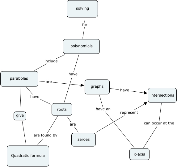This Concept Map, created with IHMC CmapTools, has information related to: kyrstenk, polynomials have roots, graphs have an x-axis, roots are zeroes, solving for polynomials, roots are found by Quadratic formula, parabolas are graphs, graphs have intersections, zeroes represent intersections, polynomials include parabolas, parabolas have roots, intersections can occur at the x-axis, parabolas Quadratic formula