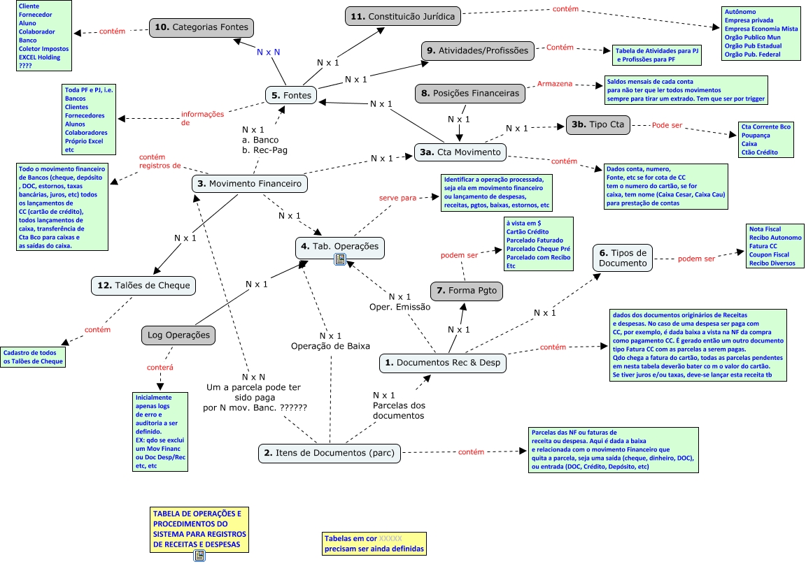 Esse mapa conceitual, produzido no IHMC CmapTools, tem a informação relacionada a: Sistema Financeiro- Estruturas de Dados V 2.0, 3. Movimento Financeiro N x 1 3a. Cta Movimento, 5. Fontes N x N 10. Categorias Fontes, 8. Posições Financeiras Armazena Saldos mensais de cada conta para não ter que ler todos movimentos sempre para tirar um extrado. Tem que ser por trigger, 2. Itens de Documentos (parc) N x 1 Parcelas dos documentos 1. Documentos Rec & Desp, 10. Categorias Fontes contém Cliente Fornecedor Aluno Colaborador Banco Coletor Impostos EXCEL Holding ????, 12. Talões de Cheque contém Cadastro de todos os Talões de Cheque, 9. Atividades/Profissões Contém Tabela de Atividades para PJ e Profissões para PF, 1. Documentos Rec & Desp N x 1 7. Forma Pgto, 6. Tipos de Documento podem ser Nota Fiscal Recibo Autonomo Fatura CC Coupon Fiscal Recibo Diversos, 3a. Cta Movimento N x 1 3b. Tipo Cta, 4. Tab. Operações serve para Identificar a operação processada, seja ela em movimento financeiro ou lançamento de despesas, receitas, pgtos, baixas, estornos, etc, 7. Forma Pgto podem ser à vista em $ Cartão Crédito Parcelado Faturado Parcelado Cheque Pré Parcelado com Recibo Etc, 5. Fontes N x 1 9. Atividades/Profissões, 2. Itens de Documentos (parc) contém Parcelas das NF ou faturas de receita ou despesa. Aqui é dada a baixa e relacionada com o movimento Financeiro que quita a parcela, seja uma saída (cheque, dinheiro, DOC), ou entrada (DOC, Crédito, Depósito, etc), 5. Fontes informações de Toda PF e PJ, i.e. Bancos Clientes Fornecedores Alunos Colaboradores Próprio Excel etc, 1. Documentos Rec & Desp contém dados dos documentos originários de Receitas e despesas. No caso de uma despesa ser paga com CC, por exemplo, é dada baixa a vista na NF da compra como pagamento CC. É gerado então um outro documento tipo Fatura CC com as parcelas a serem pagas. Qdo chega a fatura do cartão, todas as parcelas pendentes em nesta tabela deverão bater co m o valor do cartão. Se tiver juros e/ou taxas, deve-se lançar esta receita tb, Log Operações conterá Inicialmente apenas logs de erro e auditoria a ser definido. EX: qdo se exclui um Mov Financ ou Doc Desp/Rec etc, etc, 3a. Cta Movimento N x 1 5. Fontes, 3. Movimento Financeiro N x 1 4. Tab. Operações, 1. Documentos Rec & Desp N x 1 Oper. Emissão 4. Tab. Operações