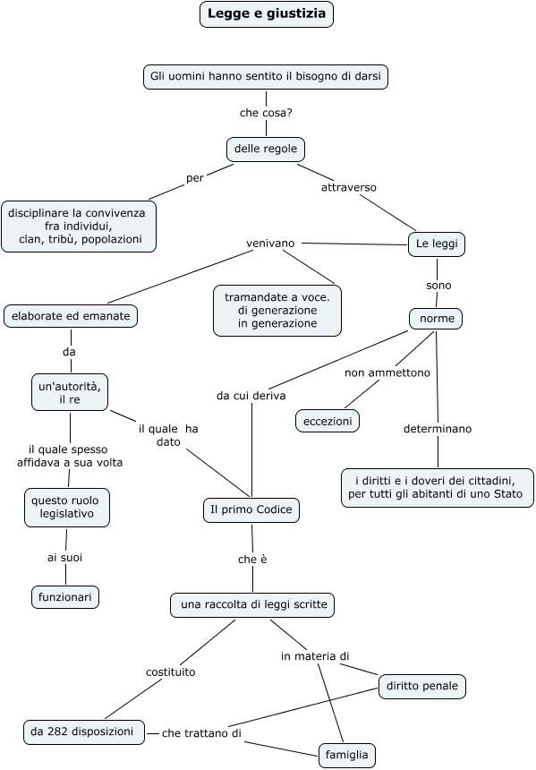 Questa Cmap, creata con IHMC CmapTools, contiene informazioni relative a: legge e giustizia, norme determinano i diritti e i doveri dei cittadini, per tutti gli abitanti di uno Stato, eccezioni non ammettono norme, una raccolta di leggi scritte costituito da 282 disposizioni, una raccolta di leggi scritte in materia di famiglia, una raccolta di leggi scritte in materia di diritto penale, delle regole attraverso Le leggi, un'autorità, il re il quale spesso affidava a sua volta questo ruolo legislativo, elaborate ed emanate da un'autorità, il re, questo ruolo legislativo ai suoi funzionari, delle regole per disciplinare la convivenza fra individui, clan, tribù, popolazioni, un'autorità, il re il quale ha dato Il primo Codice, norme da cui deriva Il primo Codice, Le leggi venivano tramandate a voce. di generazione in generazione, Le leggi sono norme, Le leggi venivano elaborate ed emanate, Il primo Codice che è una raccolta di leggi scritte, da 282 disposizioni che trattano di famiglia, Gli uomini hanno sentito il bisogno di darsi che cosa? delle regole, da 282 disposizioni che trattano di diritto penale