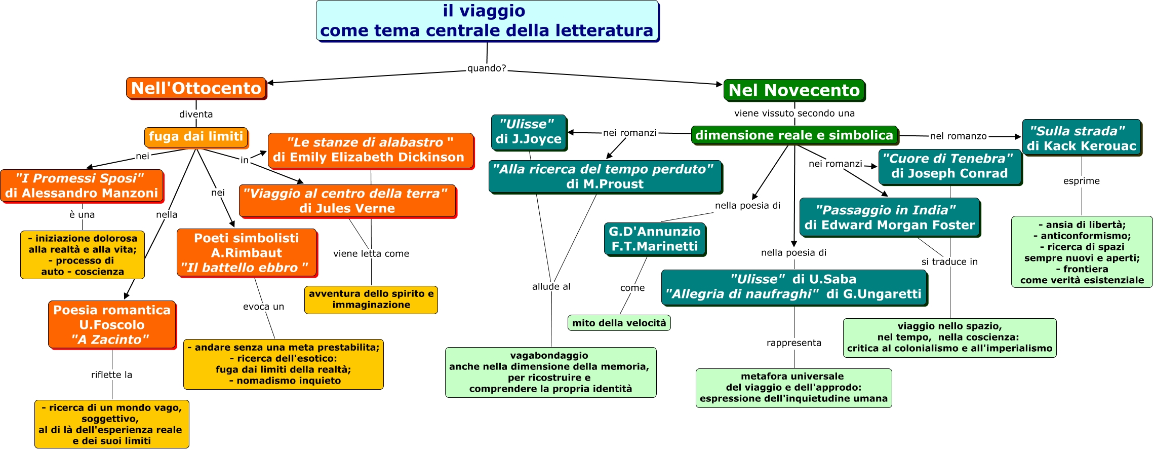 Questa Cmap, creata con IHMC CmapTools, contiene informazioni relative a: viaggio come tema centrale della letteratura due, dimensione reale e simbolica nei romanzi "Ulisse" di J.Joyce, il viaggio come tema centrale della letteratura quando? Nell'Ottocento, Poesia romantica U.Foscolo "A Zacinto" riflette la - ricerca di un mondo vago, soggettivo, al di là dell'esperienza reale e dei suoi limiti, "Le stanze di alabastro" di Emily Elizabeth Dickinson viene letta come "Viaggio al centro della terra" di Jules Verne, "Alla ricerca del tempo perduto" di M.Proust allude al vagabondaggio anche nella dimensione della memoria, per ricostruire e comprendere la propria identità, dimensione reale e simbolica nei romanzi "Cuore di Tenebra" di Joseph Conrad, "Passaggio in India" di Edward Morgan Foster si traduce in "Cuore di Tenebra" di Joseph Conrad, "I Promessi Sposi" di Alessandro Manzoni è una - iniziazione dolorosa alla realtà e alla vita; - processo di auto - coscienza, Nell'Ottocento diventa fuga dai limiti, "Sulla strada" di Kack Kerouac esprime - ansia di libertà; - anticonformismo; - ricerca di spazi sempre nuovi e aperti; - frontiera come verità esistenziale, Poeti simbolisti A.Rimbaut "Il battello ebbro" evoca un - andare senza una meta prestabilita; - ricerca dell'esotico: fuga dai limiti della realtà; - nomadismo inquieto, G.D'Annunzio F.T.Marinetti come mito della velocità, "Ulisse" di U.Saba "Allegria di naufraghi" di G.Ungaretti rappresenta metafora universale del viaggio e dell'approdo: espressione dell'inquietudine umana, dimensione reale e simbolica nella poesia di "Ulisse" di U.Saba "Allegria di naufraghi" di G.Ungaretti, "Alla ricerca del tempo perduto" di M.Proust allude al "Ulisse" di J.Joyce, il viaggio come tema centrale della letteratura quando? Nel Novecento, dimensione reale e simbolica nei romanzi "Passaggio in India" di Edward Morgan Foster, dimensione reale e simbolica nel romanzo "Sulla strada" di Kack Kerouac, Nel Novecento viene vissuto secondo una dimensione reale e simbolica, "Le stanze di alabastro" di Emily Elizabeth Dickinson viene letta come avventura dello spirito e immaginazione