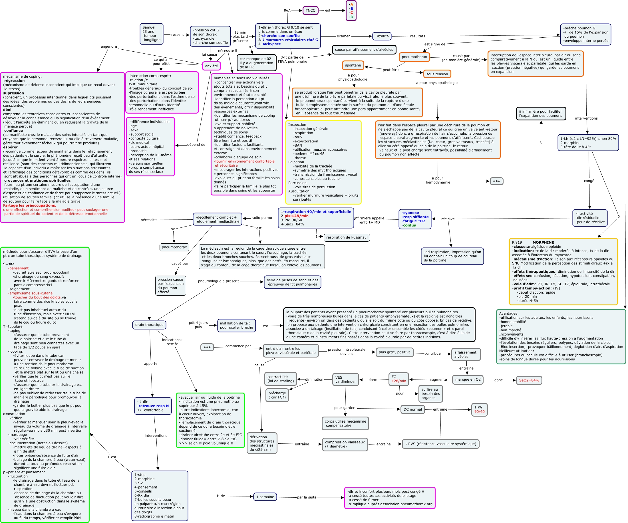 Cette carte conceptuelle, cree avec IHMC CmapTools, contient des informations liees a : Apsic 2_ pneumothorax+drain thoracique, -décollement complet + refoulement médiastinale nécessite drain thoracique, 1-respiration 40/min et superficielle 2-pls:128/min 3-PA: 90/60 4-Sao2: 84% 1 respiration de kussmaul, 1-LN (o2 c LN=92%) sinon 89% 2-morphine 3-tête de lit à 45° 2 P.819 MORPHINE -classe:analgésique opioïde -indication: tx de la dlr modérée à intense, tx de la dlr associée à l'infarctus du myocarde -mécanisme d'action: liaison aux récepteurs opioïdes du SNC.Modification de la perception des stimuli dlreux +rx à la dlr -effets thérapeutiques: diminution de l'intensité de la dlr -effets sec:confusion, sédation, hypotension, constipation, nausées -voie d'adm: PO, IR, IM, SC, IV, épidurale, intrathécale -profil temps-action: (IV) -début d'action:rapide -pic:20 min -durée:4-5h, DC normal entraîne ↓ PA 90/60, 1-stop 2-morphine 3-SV 4-pansement 5-conseils 6-Rx die 7-bulles sous la peau en palpant a/n cou+région autour site d'insertion c bout des doigts 8-radiographie q matin 1-est méthode pour s'assurer d'EVA la base d'un pt c un tube thoracique+système de drainage S=site -pansement -devrait être sec, propre,occlusif -si drainage ou sang excessif: avertir MD+mettre gants et renforcer pans c compresse 4x4 -saignement -emphysème sous-cutané -toucher du bout des doigts,va faire comme des rice krispies sous la peau. -n'est pas inhabituel autour du tube d'insertion, mais avertir MD si s'étend au-delà du site ou se trouve ds le cou ou figure du pt T=tubulure -taping -s'assurer que le tube provenant de la poitrine et que le tube du drainage sont bien connectés avec un tape de 1/2 pouce en spiral -looping: -éviter loupe dans le tube car peuvent entraver le drainage et mener à une tension ds le pneumothorax -faire une bobine avec le tube de succion et le mettre plat sur le lit ou une chaise -vérifier que le pt n'est pas sur le tube et l'obstrue -s'assurer que le tube pr le drainage est en ligne droite -ne pas oublier de redresser tte le tube de manière périodique pour promouvoir le drainage -garder le boîtier plus bas que le pt pour que la gravité aide le drainage o=oscillation -vérifier -vérifier et marquer sour le pleur-evac le niveau du volume de drainage à intervalle régulier-au mois q30 min post insertion -marquage -voir vérifier -documentation (notes au dossier) -mettre qté de liquide drainé+aspects à q fin de shitf -noter présence/absence de fuite d'air -bullage ds la chambre à eau (water-seal) durant la toux ou profondes respirations signifient une fuite d'air p=patient et pansement -fluctuation -le drainage dans le tube et l'eau de la chambre à eau devrait fluctuer pdt respiration -absence de drainage ds la chambre ou absence de fluctuation peut vouloir dire qu'il y a une obstruction dans le système de drainage -niveau dans la chambre à eau -l'eau dans la chambre à eau s'évapore au fil du temps, vérifier et remplir PRN, 1-respiration 40/min et superficielle 2-pls:128/min 3-PA: 90/60 4-Sao2: 84% radio pulmo -décollement complet + refoulement médiastinale, affaissement alvéoles entraîne manque en O2, VES va diminuer pour garder corps utilise mécanisme compensatoire, manque en O2 augmente FC 128/min, manque en O2 donc SaO2=84%, VES va diminuer diminution contractilité (loi de starling), 1-dlr a/n thorax G 9/10 se sent pris comme dans un étau 2-cherche son souffle 3-↓ murmures vésiculaires côté G 4-tachypnée 4 car manque de 02 il y a augmentation de la FR, -décollement complet + refoulement médiastinale sx pneumothorax, 1-LN (o2 c LN=92%) sinon 89% 2-morphine 3-tête de lit à 45° 3 ii infirmière pour faciliter l'expantion des poumons, drain thoracique indications+ sert à: -évacuer air ou fluide de la poitrine -l'indication est une pneumothorax supérieur à 15% -autre indications:lobectomie, chx à coeur ouvert, exploration de thoracotomie -l'emplacement du drain thoracique dépend de ce qui a besoin d'être suctionné -drainer air=tube entre 2e et 3e EIC -drainer fluide= entre 7-8-9e EIC >>> selon le poid volumique!!!, -décollement complet + refoulement médiastinale causé par pression causé par l'expansion du poumon affecté, drain thoracique pdt 4 jours puis instillation de talc pour sceller brèche, plus grde, positive contribue affaissement alvéoles, -brèche poumon G -↓ de 15% de l'expansion du poumon -enveloppe interne percée est signe de pneumothorax, -pression côt G de son thorax -tachycardie -cherche son souffle 15 min plus tard présente 1-dlr a/n thorax G 9/10 se sent pris comme dans un étau 2-cherche son souffle 3-↓ murmures vésiculaires côté G 4-tachypnée