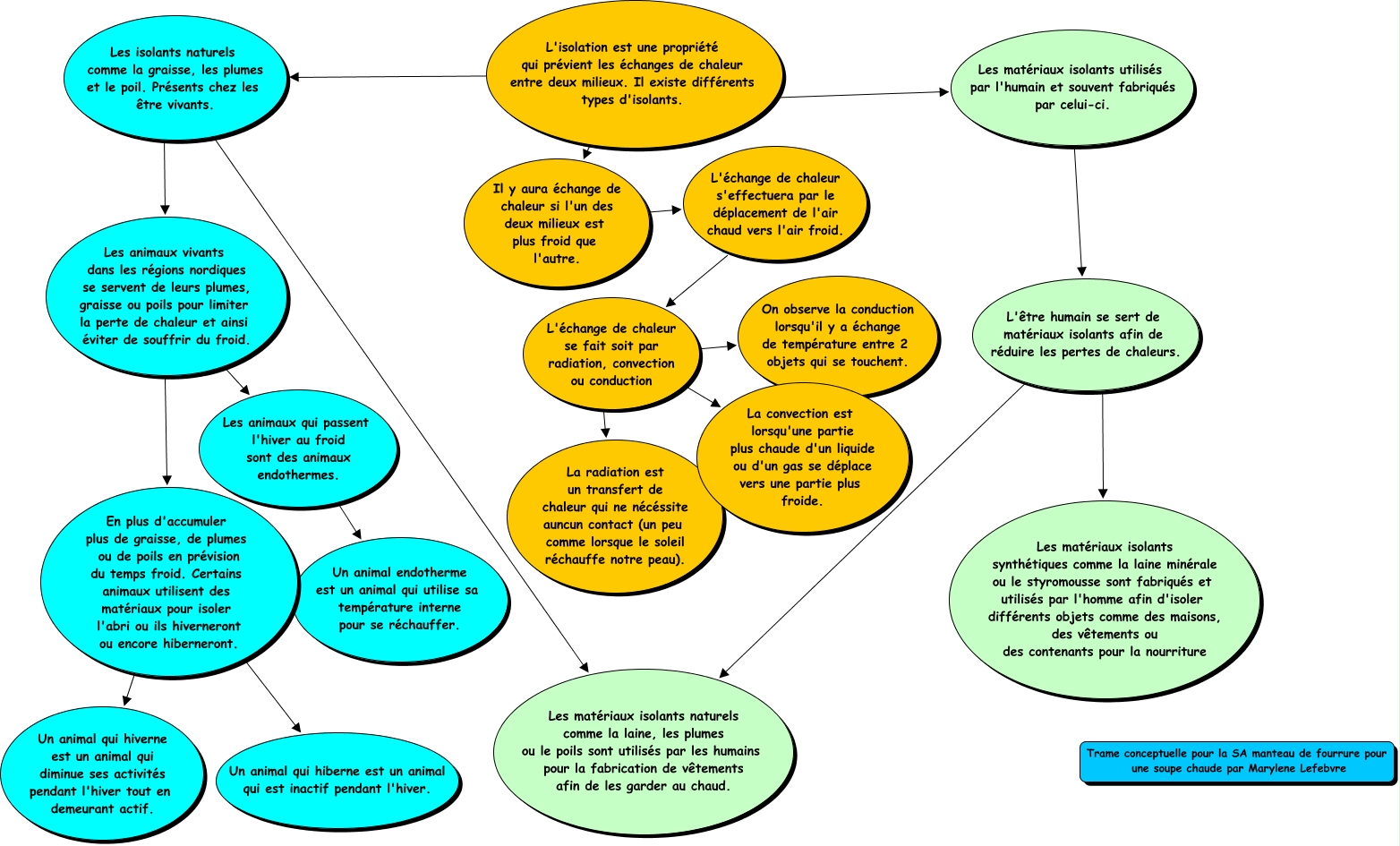 Cette carte conceptuelle, cree avec IHMC CmapTools, contient des informations liees a : manteau de poil (Lefebvre), Il y aura échange de chaleur si l'un des deux milieux est plus froid que l'autre. ???? L'échange de chaleur s'effectuera par le déplacement de l'air chaud vers l'air froid., Les matériaux isolants utilisés par l'humain et souvent fabriqués par celui-ci. ???? L'être humain se sert de matériaux isolants afin de réduire les pertes de chaleurs., Les animaux vivants dans les régions nordiques se servent de leurs plumes, graisse ou poils pour limiter la perte de chaleur et ainsi éviter de souffrir du froid. ???? En plus d'accumuler plus de graisse, de plumes ou de poils en prévision du temps froid. Certains animaux utilisent des matériaux pour isoler l'abri ou ils hiverneront ou encore hiberneront., L'être humain se sert de matériaux isolants afin de réduire les pertes de chaleurs. ???? Les matériaux isolants naturels comme la laine, les plumes ou le poils sont utilisés par les humains pour la fabrication de vêtements afin de les garder au chaud., En plus d'accumuler plus de graisse, de plumes ou de poils en prévision du temps froid. Certains animaux utilisent des matériaux pour isoler l'abri ou ils hiverneront ou encore hiberneront. ???? Un animal qui hiverne est un animal qui diminue ses activités pendant l'hiver tout en demeurant actif., Les animaux vivants dans les régions nordiques se servent de leurs plumes, graisse ou poils pour limiter la perte de chaleur et ainsi éviter de souffrir du froid. ???? Les animaux qui passent l'hiver au froid sont des animaux endothermes., L'isolation est une propriété qui prévient les échanges de chaleur entre deux milieux. Il existe différents types d'isolants. ???? Les isolants naturels comme la graisse, les plumes et le poil. Présents chez les être vivants., L'isolation est une propriété qui prévient les échanges de chaleur entre deux milieux. Il existe différents types d'isolants. ???? Il y aura échange de chaleur si l'un des deux milieux est plus froid que l'autre., L'échange de chaleur se fait soit par radiation, convection ou conduction ???? La radiation est un transfert de chaleur qui ne nécéssite auncun contact (un peu comme lorsque le soleil réchauffe notre peau)., L'isolation est une propriété qui prévient les échanges de chaleur entre deux milieux. Il existe différents types d'isolants. ???? Les matériaux isolants utilisés par l'humain et souvent fabriqués par celui-ci., L'être humain se sert de matériaux isolants afin de réduire les pertes de chaleurs. ???? Les matériaux isolants synthétiques comme la laine minérale ou le styromousse sont fabriqués et utilisés par l'homme afin d'isoler différents objets comme des maisons, des vêtements ou des contenants pour la nourriture, Les isolants naturels comme la graisse, les plumes et le poil. Présents chez les être vivants. ???? Les animaux vivants dans les régions nordiques se servent de leurs plumes, graisse ou poils pour limiter la perte de chaleur et ainsi éviter de souffrir du froid., L'échange de chaleur se fait soit par radiation, convection ou conduction ???? La convection est lorsqu'une partie plus chaude d'un liquide ou d'un gas se déplace vers une partie plus froide., Les animaux qui passent l'hiver au froid sont des animaux endothermes. ???? Un animal endotherme est un animal qui utilise sa température interne pour se réchauffer., En plus d'accumuler plus de graisse, de plumes ou de poils en prévision du temps froid. Certains animaux utilisent des matériaux pour isoler l'abri ou ils hiverneront ou encore hiberneront. ???? Un animal qui hiberne est un animal qui est inactif pendant l'hiver., L'échange de chaleur se fait soit par radiation, convection ou conduction ???? On observe la conduction lorsqu'il y a échange de température entre 2 objets qui se touchent., L'échange de chaleur s'effectuera par le déplacement de l'air chaud vers l'air froid. ???? L'échange de chaleur se fait soit par radiation, convection ou conduction, Les isolants naturels comme la graisse, les plumes et le poil. Présents chez les être vivants. ???? Les matériaux isolants naturels comme la laine, les plumes ou le poils sont utilisés par les humains pour la fabrication de vêtements afin de les garder au chaud.