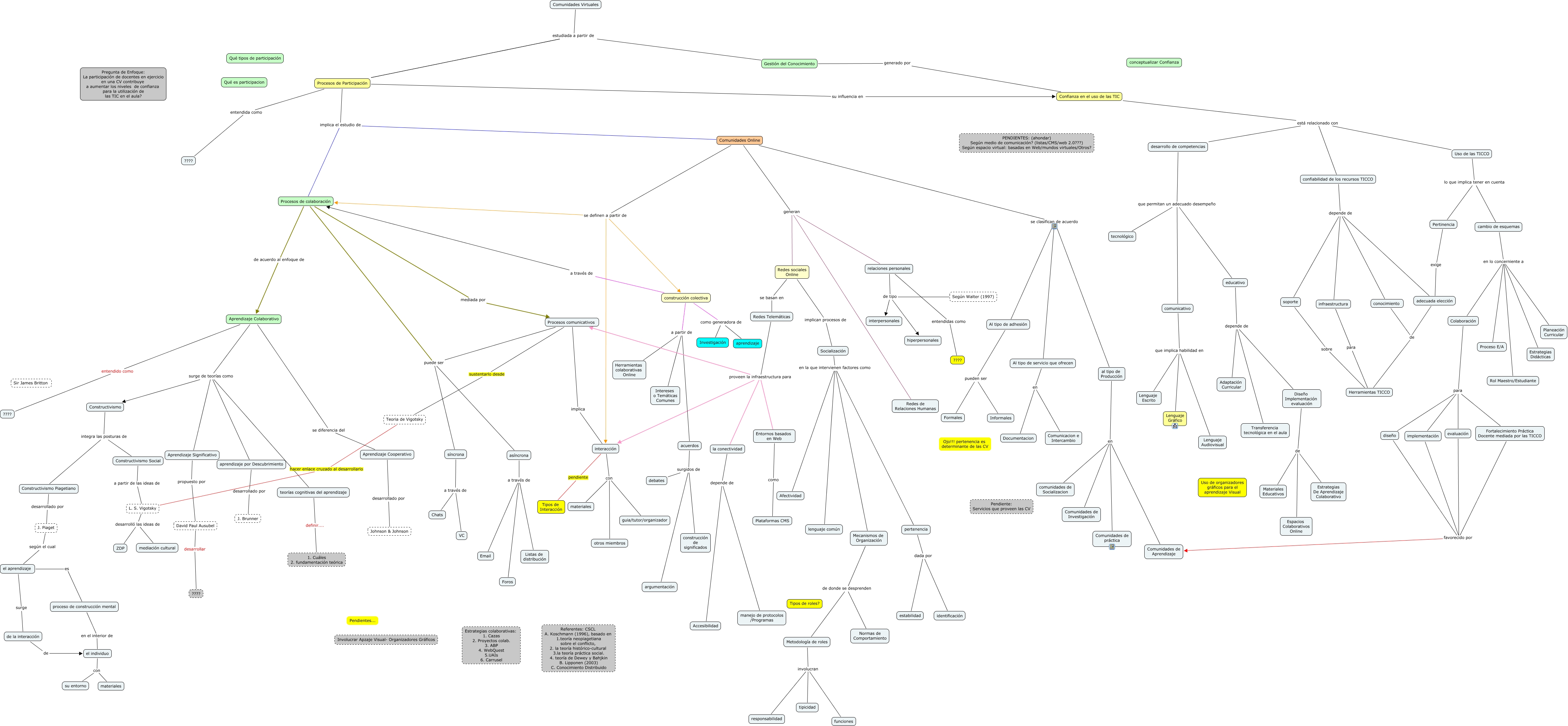Este Cmap, tiene información relacionada con: Aprendizaje Colaborativo, pertenencia dada por identificación, Confianza en el uso de las TIC está relacionado con Uso de las TICCO, L. S. Vigotsky desarrolló las ideas de mediación cultural, infraestructura para Herramientas TICCO, al tipo de Producción en Comunidades de Aprendizaje, síncrona a través de Chats, interacción con guia/tutor/organizador, Procesos comunicativos implica interacción, desarrollo de competencias que permitan un adecuado desempeño comunicativo, construcción colectiva a partir de Herramientas colaborativas Online, Comunidades Virtuales estudiada a partir de Procesos de Participación, relaciones personales de tipo hiperpersonales, interacción con materiales, Socialización en la que intervienen factores como Afectividad, comunicativo que implica habilidad en Lenguaje Escrito, comunicativo que implica habilidad en Lenguaje Gráfico, Colaboración para Fortalecimiento Práctica Docente mediada por las TICCO, Procesos de Participación implica el estudio de Procesos de colaboración, Procesos de colaboración mediada por Procesos comunicativos, al tipo de Producción en Comunidades de práctica