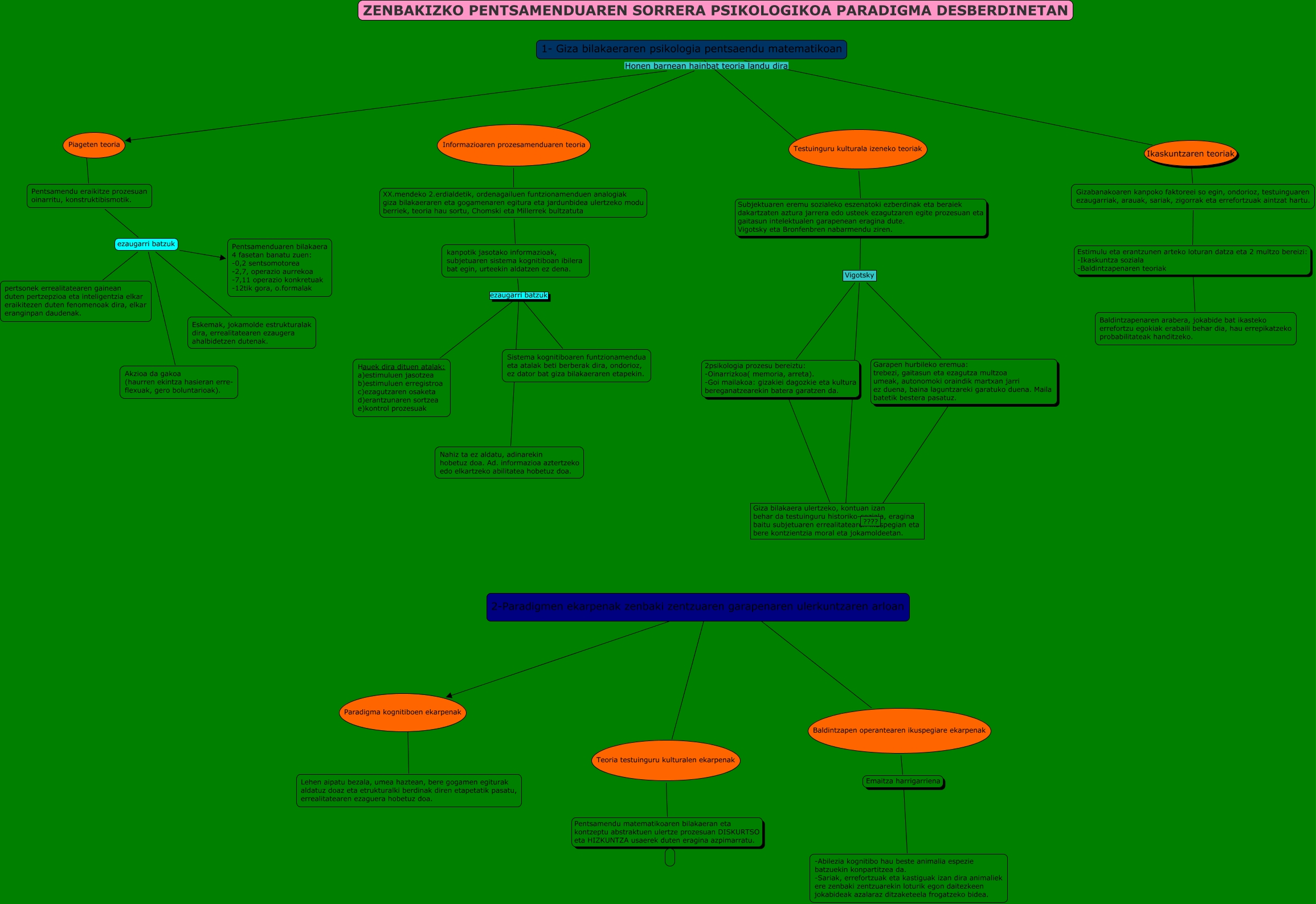 Este Cmap, tiene información relacionada con: zenbakizko pentsamendua. nerea angulo, Pentsamendu eraikitze prozesuan oinarritu, konstruktibismotik. ezaugarri batzuk Eskemak, jokamolde estrukturalak dira, errealitatearen ezaugera ahalbidetzen dutenak., Informazioaren prozesamenduaren teoria XX.mendeko 2.erdialdetik, ordenagailuen funtzionamenduen analogiak giza bilakaeraren eta gogamenaren egitura eta jardunbidea ulertzeko modu berriek, teoria hau sortu, Chomski eta Millerrek bultzatuta kanpotik jasotako informazioak, subjetuaren sistema kognitiboan ibilera bat egin, urteekin aldatzen ez dena., Vigotsky ???? Giza bilakaera ulertzeko, kontuan izan behar da testuinguru historiko-soziala, eragina baitu subjetuaren errealitatearen ikuspegian eta bere kontzientzia moral eta jokamoldeetan., kanpotik jasotako informazioak, subjetuaren sistema kognitiboan ibilera bat egin, urteekin aldatzen ez dena. ezaugarri batzuk Nahiz ta ez aldatu, adinarekin hobetuz doa. Ad. informazioa aztertzeko edo elkartzeko abilitatea hobetuz doa., 2-Paradigmen ekarpenak zenbaki zentzuaren garapenaren ulerkuntzaren arloan ???? Teoria testuinguru kulturalen ekarpenak, Paradigma kognitiboen ekarpenak ???? Lehen aipatu bezala, umea haztean, bere gogamen egiturak aldatuz doaz eta etrukturalki berdinak diren etapetatik pasatu, errealitatearen ezaguera hobetuz doa., kanpotik jasotako informazioak, subjetuaren sistema kognitiboan ibilera bat egin, urteekin aldatzen ez dena. ezaugarri batzuk Hauek dira dituen atalak: a)estimuluen jasotzea b)estimuluen erregistroa c)ezagutzaren osaketa d)erantzunaren sortzea e)kontrol prozesuak, Vigotsky Garapen hurbileko eremua: trebezi, gaitasun eta ezagutza multzoa umeak, autonomoki oraindik martxan jarri ez duena, baina laguntzareki garatuko duena. Maila batetik bestera pasatuz. ????, Vigotsky 2psikologia prozesu bereiztu: -Oinarrizkoa( memoria, arreta). -Goi mailakoa: gizakiei dagozkie eta kultura bereganatzearekin batera garatzen da. Giza bilakaera ulertzeko, kontuan izan behar da testuinguru historiko-soziala, eragina baitu subjetuaren errealitatearen ikuspegian eta bere kontzientzia moral eta jokamoldeetan., Pentsamendu eraikitze prozesuan oinarritu, konstruktibismotik. ezaugarri batzuk pertsonek errealitatearen gainean duten pertzepzioa eta inteligentzia elkar eraikitezen duten fenomenoak dira, elkar eranginpan daudenak., Pentsamendu eraikitze prozesuan oinarritu, konstruktibismotik. ezaugarri batzuk Akzioa da gakoa (haurren ekintza hasieran erre- flexuak, gero boluntarioak)., 1- Giza bilakaeraren psikologia pentsaendu matematikoan Honen barnean hainbat teoria landu dira Informazioaren prozesamenduaren teoria, 2-Paradigmen ekarpenak zenbaki zentzuaren garapenaren ulerkuntzaren arloan ???? Paradigma kognitiboen ekarpenak, kanpotik jasotako informazioak, subjetuaren sistema kognitiboan ibilera bat egin, urteekin aldatzen ez dena. ezaugarri batzuk Sistema kognitiboaren funtzionamendua eta atalak beti berberak dira, ondorioz, ez dator bat giza bilakaeraren etapekin., Piageten teoria ???? Pentsamendu eraikitze prozesuan oinarritu, konstruktibismotik., Pentsamendu eraikitze prozesuan oinarritu, konstruktibismotik. ezaugarri batzuk Pentsamenduaren bilakaera 4 fasetan banatu zuen: -0,2 sentsomotorea -2,7, operazio aurrekoa -7,11 operazio konkretuak -12tik gora, o.formalak, 2-Paradigmen ekarpenak zenbaki zentzuaren garapenaren ulerkuntzaren arloan ???? Baldintzapen operantearen ikuspegiare ekarpenak, 1- Giza bilakaeraren psikologia pentsaendu matematikoan Honen barnean hainbat teoria landu dira Piageten teoria, Testuinguru kulturala izeneko teoriak Subjektuaren eremu sozialeko eszenatoki ezberdinak eta beraiek dakartzaten aztura jarrera edo usteek ezagutzaren egite prozesuan eta gaitasun intelektualen garapenean eragina dute. Vigotsky eta Bronfenbren nabarmendu ziren. Vigotsky, 1- Giza bilakaeraren psikologia pentsaendu matematikoan ???? Testuinguru kulturala izeneko teoriak
