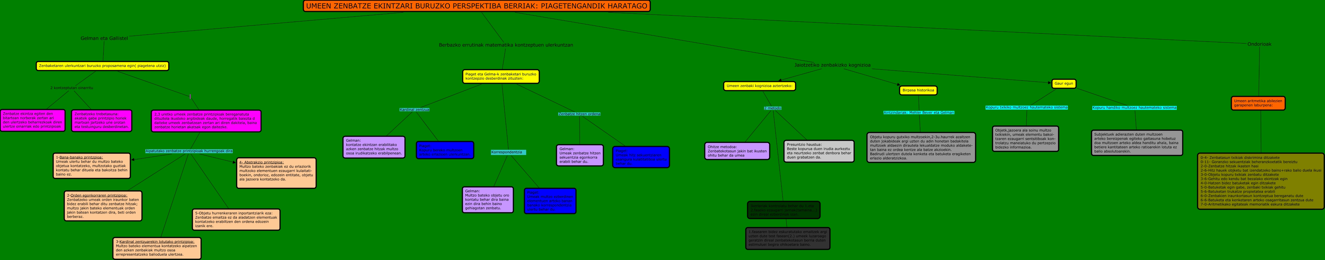 Este Cmap, tiene información relacionada con: Umeen zenbatze ekintzari buruzko prespektiba.Nerea Angulo, UMEEN ZENBATZE EKINTZARI BURUZKO PERSPEKTIBA BERRIAK: PIAGETENGANDIK HARATAGO Gelman eta Gallistel Zenbaketaren ulerkuntzari buruzko proposamena egin( piagetena utziz), 2,3 uretko umeek zenbatze printzipioak bereganatuta dituztela ikusteko argibideak daude, horregatik baiezta d daiteke umeek zenbatzean zertan ari diren dakitela, baina zenbatze horietan akatsak egon daitezke. Aipatutako zenbatze printzipioak hurrengoak dira 4- Abstrakzio printzipioa: Multzo bateko zenbakiak ez du erlaziorik multzoko elementuen ezaugarri kulaitati- boekin, ondorioz, edozein entitate, objetu ala jazoera kontatzeko da., UMEEN ZENBATZE EKINTZARI BURUZKO PERSPEKTIBA BERRIAK: PIAGETENGANDIK HARATAGO Berbazko errutinak matematika kontzeptuen ulerkuntzan Piaget eta Gelma-k zenbaketari buruzko kontzepzio desberdinak zituzten:, Piaget eta Gelma-k zenbaketari buruzko kontzepzio desberdinak zituzten: Korrespondentzia Piaget: Umeak multzo ezberdinen elementuen arteko banan banako korrespondentzia ulertu behar du., Umeen aritmetika abilezien garapenen laburpena: ???? 0-4- Zenbatasun txikiak diskrimina ditzakete 0-11- Goranzko sekuentziak beheranzkoetatik bereiztu 2-0-Zenbatze hitzak ikasten hasi 2-6-Hitz hauek objketu bat izendatzeko baino+rako balio duela ikusi 3-0-Objetu kopuru txikiak zenbatu ditzakete 3-6-Gehitu edo kendu bat bezalako ekintzak egin 4-0-Hatzen bidez batuketak egin ditzakete 5-0-Batuketak egin gabe, zenbaki txikiak gehitu 5-6-Batuketan trukatze propietatea erabili 6-0-Zenbakien iraunkortasun kontzeptua bereganatu dute 6-6-Batuketa eta kenketaren arteko osagarritasun zentzua dute 7-0-Aritmetikako egitateak memoriatik eskura ditzakete, Piaget eta Gelma-k zenbaketari buruzko kontzepzio desberdinak zituzten: Korrespondentzia Gelman: Multzo bateko objetu oro kontatu behar dira baina ezin dira behin baino gehiagotan zenbatu., Piaget eta Gelma-k zenbaketari buruzko kontzepzio desberdinak zituzten: Zenbatze hitzen ordena Piaget: Umeak hitz sekuentziaren esangura kulatitatiboa ulertu behar du., Umeen zenbaki kognizioa aztertzeko: 2 metodo Ohitze metodoa: Zenbatekotasun jakin bat ikusten ohitu behar da umea, Piaget eta Gelma-k zenbaketari buruzko kontzepzio desberdinak zituzten: Kardinal zentzua Gelman: kontatze ekintzan erabilitako azken zenbatze hitzak multzo osoa irudikatzeko erabilpenean., UMEEN ZENBATZE EKINTZARI BURUZKO PERSPEKTIBA BERRIAK: PIAGETENGANDIK HARATAGO Jaiotzetiko zenbakizko kognizioa Birpasa historikoa, UMEEN ZENBATZE EKINTZARI BURUZKO PERSPEKTIBA BERRIAK: PIAGETENGANDIK HARATAGO Jaiotzetiko zenbakizko kognizioa Gaur egun, Gaur egun Kopuru txikiko multzoez hautemateko sistema Objetk,jazoera ala soinu multzo txikiekin, umeak elementu bakoi- tzaren ezaugarri sentsitiboak kon- trolatzu maneiatuko du pertzepzio bidezko informazioa., Piaget eta Gelma-k zenbaketari buruzko kontzepzio desberdinak zituzten: Zenbatze hitzen ordena Gelman: Umeak zenbatze hitzen sekuentzia egonkorra erabili behar du., Umeen zenbaki kognizioa aztertzeko: 2 metodo Presuntzio haustua: Beste kopurua duen irudia aurkeztu eta neurtzeko zenbat denbora behar duen grabatzen da., Gaur egun Kopuru handiko multzoez hautemateko sistema Subjektuek adierazten duten multzoen arteko bereizpenak egiteko gaitasuna hobetuz doa multzoen arteko aldea handitu ahala, baina betiere kantitateen arteko ratioarekin lotuta ez balio absolutoarekin., Birpasa historikoa Aintzindariak: Mehler Bever eta Gelman Objetu kopuru gutxiko multzoekin,2-3u.haurrek azaltzen duten jokabideak argi uzten du adin honetan badakitela multzoek aldaezin dirautela lekualdatze moduko aldakete- tan baina ez ordea kentze ala batze akzioekin. Badirudi ulertzen dutela kenketa eta batuketa eragiketen erlazio alderatzizkoa., UMEEN ZENBATZE EKINTZARI BURUZKO PERSPEKTIBA BERRIAK: PIAGETENGANDIK HARATAGO Ondorioak Umeen aritmetika abilezien garapenen laburpena:, 2,3 uretko umeek zenbatze printzipioak bereganatuta dituztela ikusteko argibideak daude, horregatik baiezta d daiteke umeek zenbatzean zertan ari diren dakitela, baina zenbatze horietan akatsak egon daitezke. Aipatutako zenbatze printzipioak hurrengoak dira 3-Kardinal zentzuarekin lotutako printzipioa: Multzo bateko elementua kontatzeko aipatzen den azken zenbakiak multzo osoa errepresentatzeko balioduela ulertzea., 2,3 uretko umeek zenbatze printzipioak bereganatuta dituztela ikusteko argibideak daude, horregatik baiezta d daiteke umeek zenbatzean zertan ari diren dakitela, baina zenbatze horietan akatsak egon daitezke. Aipatutako zenbatze printzipioak hurrengoak dira 1-Bana-banako printzpioa: Umeak ulertu behar du multzo bateko objetua kontatzeko, multzotako guztiak kontatu behar dituela eta bakoitza behin baino ez., Piaget eta Gelma-k zenbaketari buruzko kontzepzio desberdinak zituzten: Kardinal zentzua Piaget: Kopuru bereko multzoen arteko erlazioen ulerkuntzan.