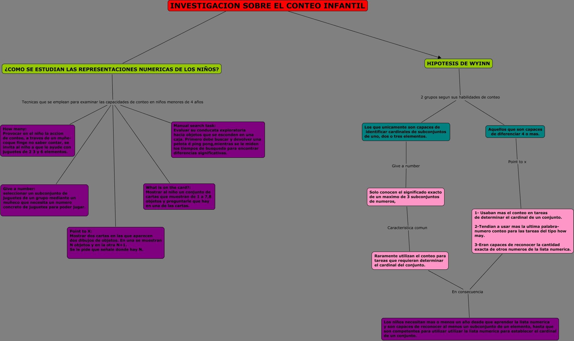 Este Cmap, tiene información relacionada con: investigacion sobre el conteo infantil.Nerea Angulo, ¿COMO SE ESTUDIAN LAS REPRESENTACIONES NUMERICAS DE LOS NIÑOS? Tecnicas que se emplean para examinar las capacidades de conteo en niños menores de 4 años Point to X: Mostrar dos cartas en las que aparecen dos dibujos de objetos. En una se muestran N objetos y en la otra N+1. Se le pide que señale donde hay N., ¿COMO SE ESTUDIAN LAS REPRESENTACIONES NUMERICAS DE LOS NIÑOS? Tecnicas que se emplean para examinar las capacidades de conteo en niños menores de 4 años Give a number: seleccionar un subconjunto de juguetes de un grupo mediante un muñeco que necesita un numero concreto de juguetes para poder jugar., HIPOTESIS DE WYINN 2 grupos segun sus habilidades de conteo Los que unicamente son capaces de identificar cardinales de subconjuntos de uno, dos o tres elementos., INVESTIGACION SOBRE EL CONTEO INFANTIL ???? ¿COMO SE ESTUDIAN LAS REPRESENTACIONES NUMERICAS DE LOS NIÑOS?, ¿COMO SE ESTUDIAN LAS REPRESENTACIONES NUMERICAS DE LOS NIÑOS? Tecnicas que se emplean para examinar las capacidades de conteo en niños menores de 4 años What is on the card?: Mostrar al niño un conjunto de cartas que muestran de 1 a 7,8 objetos y preguntarle que hay en una de las cartas., 1- Usaban mas el conteo en tareas de determinar el cardinal de un conjunto. 2-Tendian a usar mas la ultima palabra- numero conteo para las tareas del tipo how may. 3-Eran capaces de reconocer la cantidad exacta de otros numeros de la lista numerica. En consecuencia Los niños necesitan mas o menos un año desde que aprender la lista numerica y son capaces de reconocer al menos un subconjunto de un elemento, hasta que son competentes para utilizar utilizar la lista numerica para establecer el cardinal de un conjunto., Aquellos que son capaces de diferenciar 4 o mas. Point to x 1- Usaban mas el conteo en tareas de determinar el cardinal de un conjunto. 2-Tendian a usar mas la ultima palabra- numero conteo para las tareas del tipo how may. 3-Eran capaces de reconocer la cantidad exacta de otros numeros de la lista numerica., INVESTIGACION SOBRE EL CONTEO INFANTIL ???? HIPOTESIS DE WYINN, Los que unicamente son capaces de identificar cardinales de subconjuntos de uno, dos o tres elementos. Give a number Solo conocen el significado exacto de un maximo de 3 subconjuntos de numeros,, ¿COMO SE ESTUDIAN LAS REPRESENTACIONES NUMERICAS DE LOS NIÑOS? Tecnicas que se emplean para examinar las capacidades de conteo en niños menores de 4 años Manual search task: Evaluar su conducata exploratoria hacia objetos que se esconden en una caja. Primero debe buscar y devolver una pelota d ping pong,mientras se le miden los tiempos de busqueda para encontrar diferencias significativas., ¿COMO SE ESTUDIAN LAS REPRESENTACIONES NUMERICAS DE LOS NIÑOS? Tecnicas que se emplean para examinar las capacidades de conteo en niños menores de 4 años How many: Provocar en el niño la accion de conteo, a traves de un muñe- coque finge no saber contar, se invita al niño a que le ayude con juguetes de 2 3 y 6 elementos., HIPOTESIS DE WYINN 2 grupos segun sus habilidades de conteo Aquellos que son capaces de diferenciar 4 o mas., Raramente utilizan el conteo para tareas que requieran determinar el cardinal del conjunto. En consecuencia Los niños necesitan mas o menos un año desde que aprender la lista numerica y son capaces de reconocer al menos un subconjunto de un elemento, hasta que son competentes para utilizar utilizar la lista numerica para establecer el cardinal de un conjunto., Solo conocen el significado exacto de un maximo de 3 subconjuntos de numeros, Caracteristica comun Raramente utilizan el conteo para tareas que requieran determinar el cardinal del conjunto.