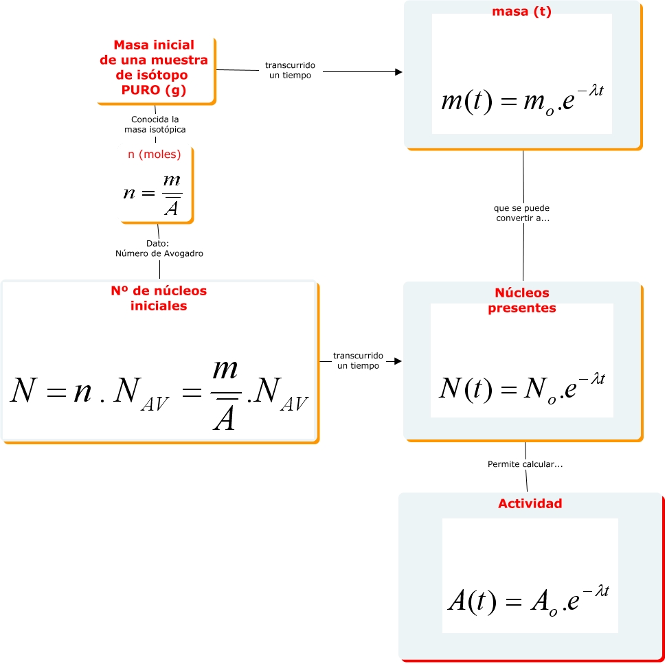 radioactividad2, Masa inicial de una muestra de isótopo PURO (g) transcurrido un tiempo masa (t), Núcleos presentes Permite calcular... Actividad, masa (t) que se puede convertir a... Núcleos presentes, n (moles) Dato: Número de Avogadro Nº de núcleos iniciales, Masa inicial de una muestra de isótopo PURO (g) Conocida la masa isotópica n (moles), Nº de núcleos iniciales transcurrido un tiempo Núcleos presentes