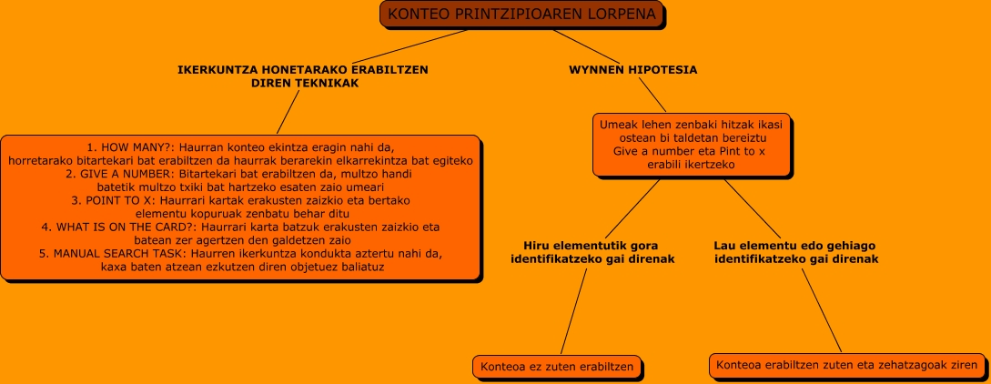 Este Cmap, tiene información relacionada con: konteo printzipioaren lorpena, Umeak lehen zenbaki hitzak ikasi ostean bi taldetan bereiztu Give a number eta Pint to x erabili ikertzeko Hiru elementutik gora identifikatzeko gai direnak Konteoa ez zuten erabiltzen, Umeak lehen zenbaki hitzak ikasi ostean bi taldetan bereiztu Give a number eta Pint to x erabili ikertzeko Lau elementu edo gehiago identifikatzeko gai direnak Konteoa erabiltzen zuten eta zehatzagoak ziren, KONTEO PRINTZIPIOAREN LORPENA WYNNEN HIPOTESIA Umeak lehen zenbaki hitzak ikasi ostean bi taldetan bereiztu Give a number eta Pint to x erabili ikertzeko, KONTEO PRINTZIPIOAREN LORPENA IKERKUNTZA HONETARAKO ERABILTZEN DIREN TEKNIKAK 1. HOW MANY?: Haurran konteo ekintza eragin nahi da, horretarako bitartekari bat erabiltzen da haurrak berarekin elkarrekintza bat egiteko 2. GIVE A NUMBER: Bitartekari bat erabiltzen da, multzo handi batetik multzo txiki bat hartzeko esaten zaio umeari 3. POINT TO X: Haurrari kartak erakusten zaizkio eta bertako elementu kopuruak zenbatu behar ditu 4. WHAT IS ON THE CARD?: Haurrari karta batzuk erakusten zaizkio eta batean zer agertzen den galdetzen zaio 5. MANUAL SEARCH TASK: Haurren ikerkuntza kondukta aztertu nahi da, kaxa baten atzean ezkutzen diren objetuez baliatuz